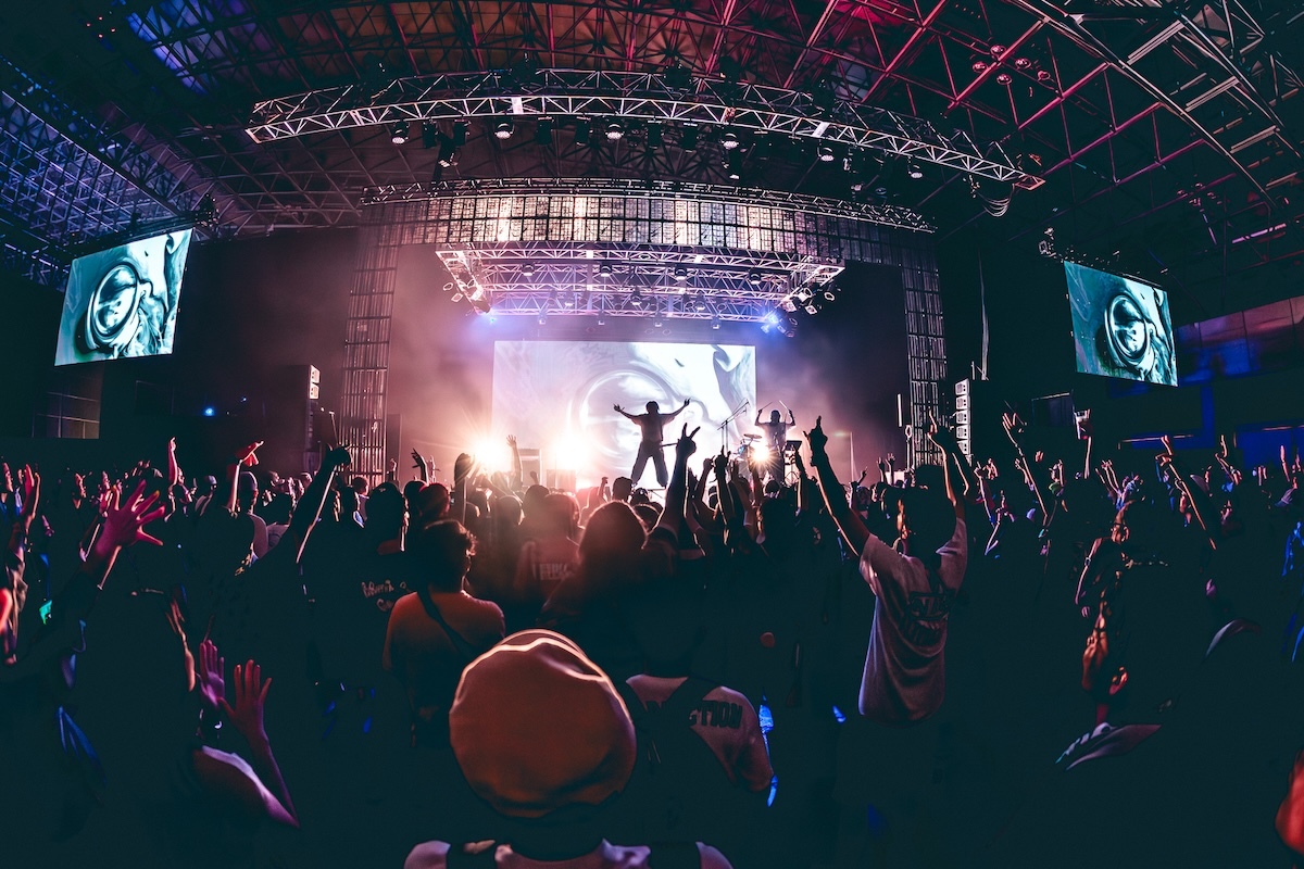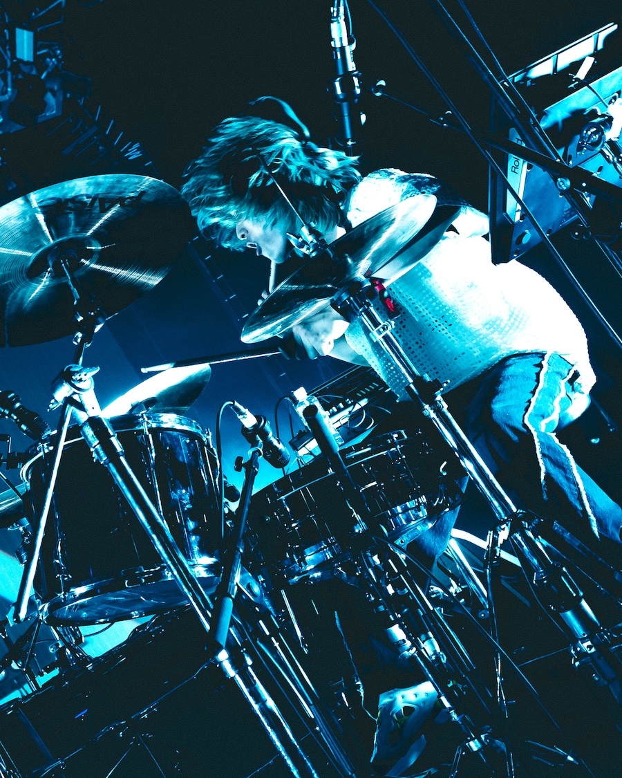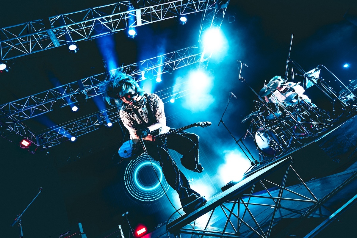 定刻の20:05からほんの少し過ぎ、オーディエンスがいい具合に焦れたタイミングでオープニングSEが鳴ると、お揃いのビビットな髪色が映える双子の兄弟が登場。そして、短めに挨拶をしたあと、攻撃的なブレイクビーツが幕張メッセに響いた。去年はラストにプレイした「Crush Core」だ。オーセンティックな高速ブレイクビーツに重なるrentの生ドラムや、唐突に心臓をダイレクトに刺激してくるサブベースで強烈に脳みそを揺らし、soutaがギターをかき鳴らしながら歌う中毒性の高いメロディが耳の中を駆け回る。印象的なレゲエパートや中近東風のメロディはAsian Dub Foundationからの影響だろうか。間奏では、soutaが「よろしくお願いしまーす!」と高らかに挨拶をし、rentもその場で立ち上がって「もっともっと」と言わんばかりにオーディエンスを煽る。この1年の間に得た自信が、2人をより前のめりにしていた。