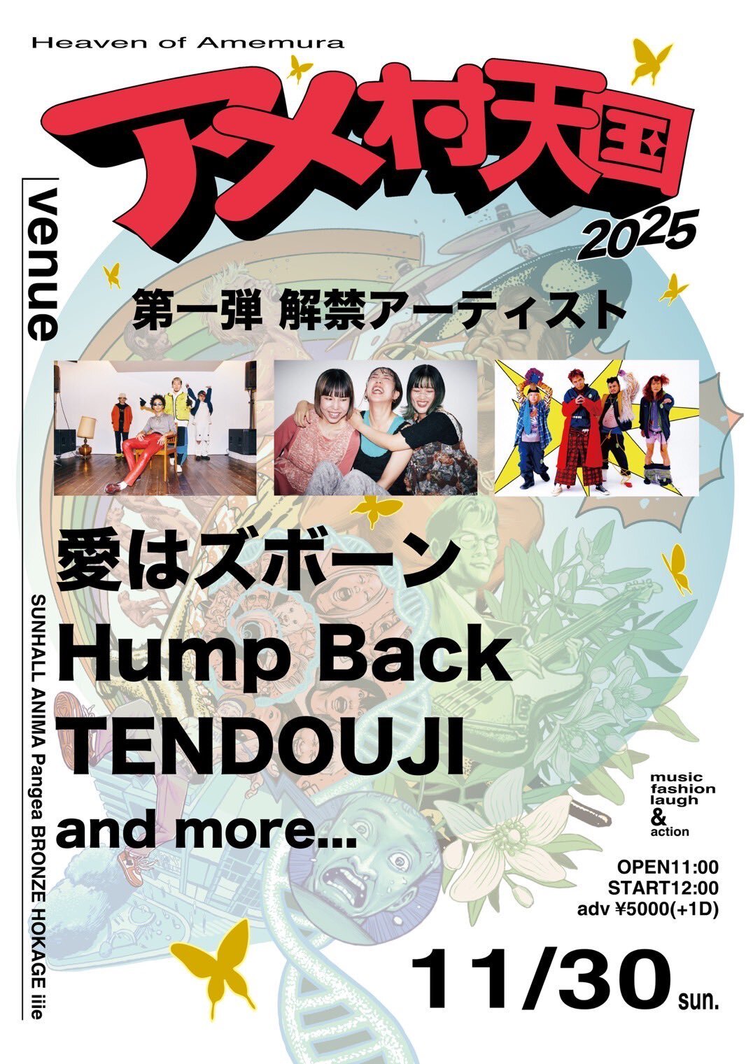 2025年11月30日(日)に大阪・アメリカ村のライブハウスなど6会場で、愛はズボーン主催フェス『アメ村天国2025』が開催決定。第1弾アーティストとして、愛はズボーンのほか、Hump Back、TENDOUJIの出演が発表された。
