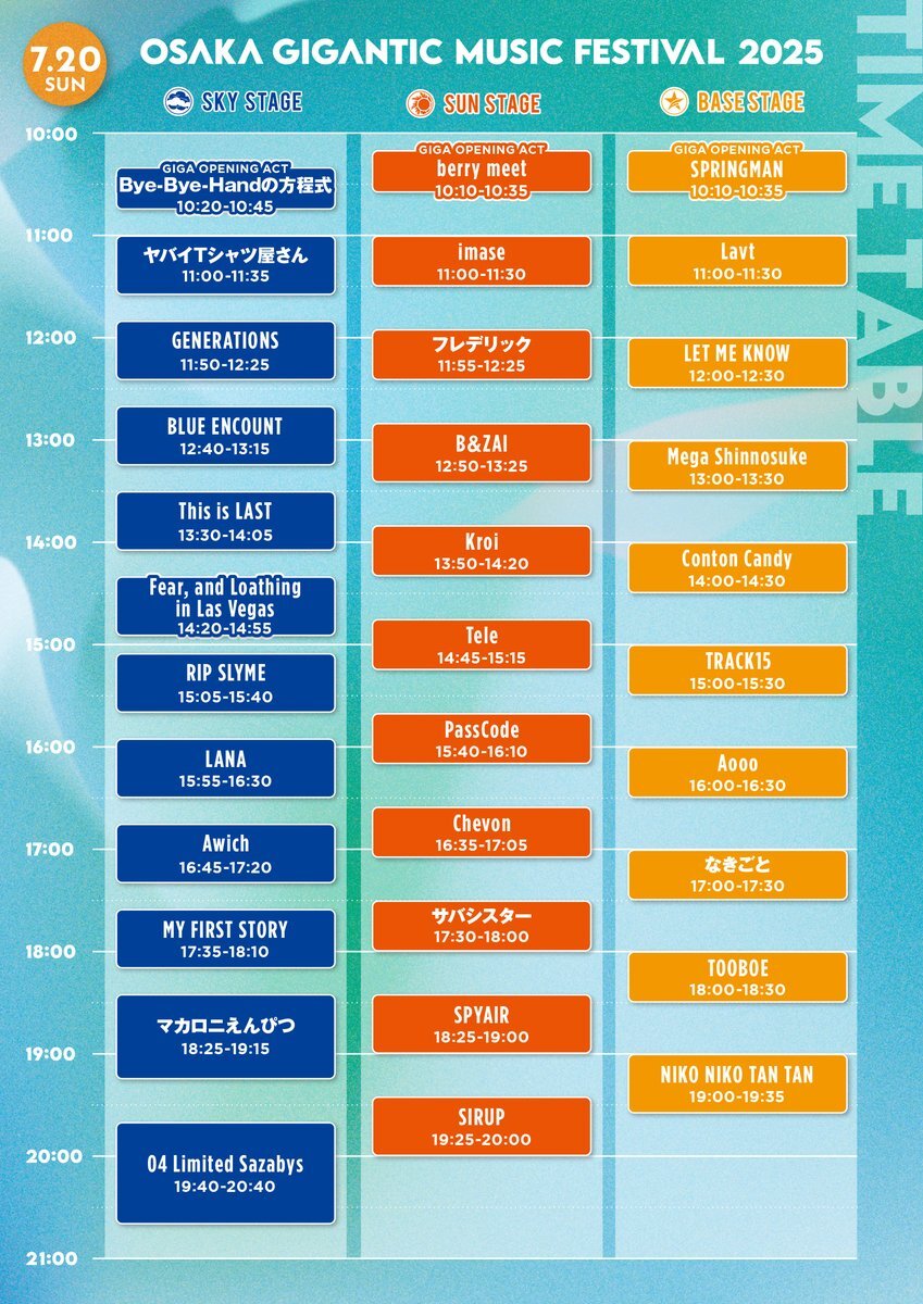 「SKY STAGE」「SUN STAGE」「BASE STAGE」の3ステージでライブが繰り広げられ、GIGA OPENING ACTのズーカラデル、猫背のネイビーセゾン、HINONABEのステージからスタート。初日は初のフェス出演が2019年の『ジャイガ』というストーリーを持ち、常に躍進を続ける緑黄色社会がトリを彩る。2日目のトリは 04 Limited Sazabys。『ジャイガ』の会場を揺らすエネルギー源として欠かせないフォーリミの熱いライブは必見だ。この2アーティストはともに演奏時間は60分間とロングセットとなることが発表されている。