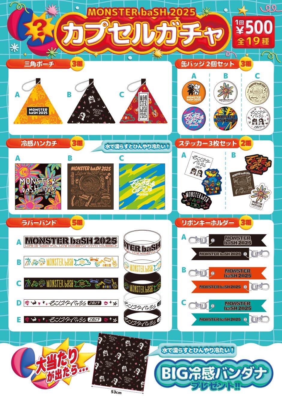 毎年大好評のオフィシャルグッズも充実。三角ポーチや冷感ハンカチ、ラバーバンドなど『モンバス』がさらに楽しくなるアイテムが当たるモンバスガチャが今年も登場し、売り場のある会場入り口とオフィシャルグッズブースが大いに賑わいをみせていた。