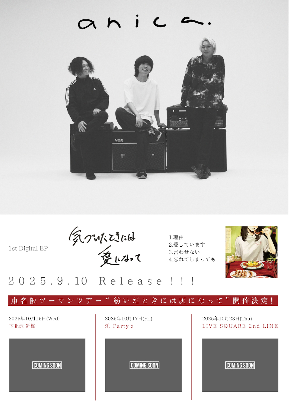 大阪府高槻市発のセンチメンタルギターロックバンド・anica。murffin discs所属後初となる1st EP『気づいたときには愛になって』の配信リリースが9月10日(水)に決定した。リリースに先立ち、表題曲「理由」の先行配信が8月27日(水)0時より各配信サイトにて開始となる。