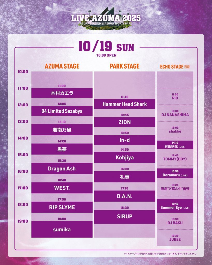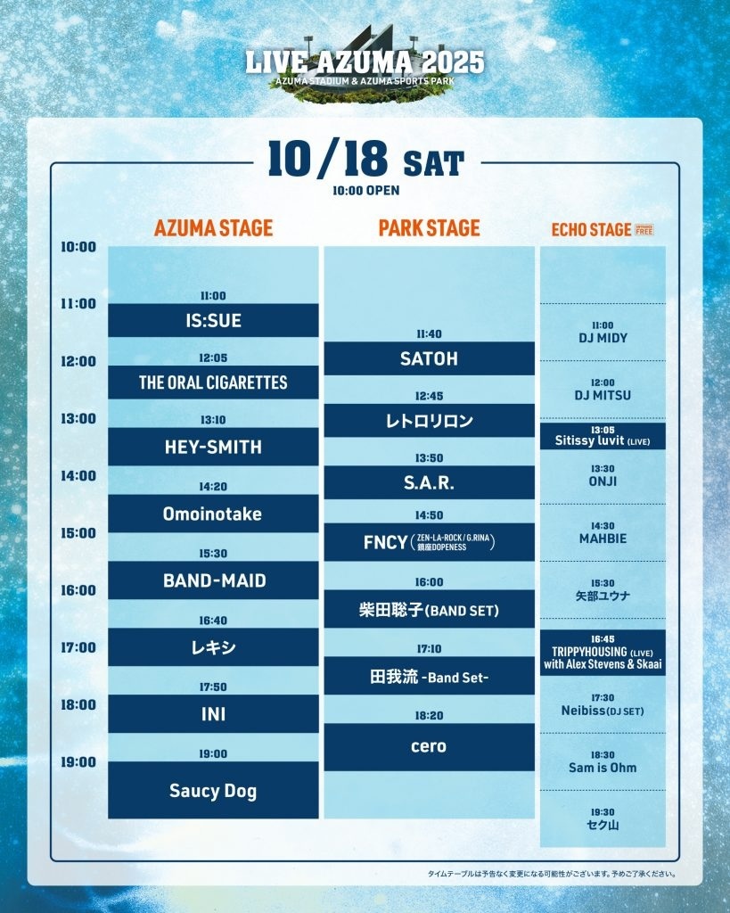 2025年10月18日(土)・19日(日)に福島あづま球場、あづま総合運動公園で開催される『LIVE AZUMA 2025』のタイムテーブル及び、最終出演アーティストが発表された。