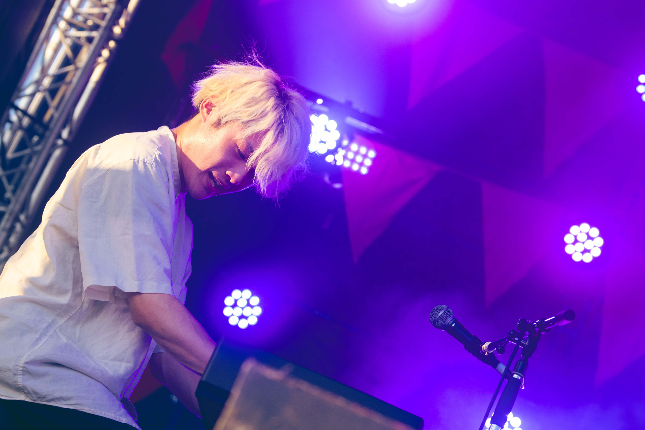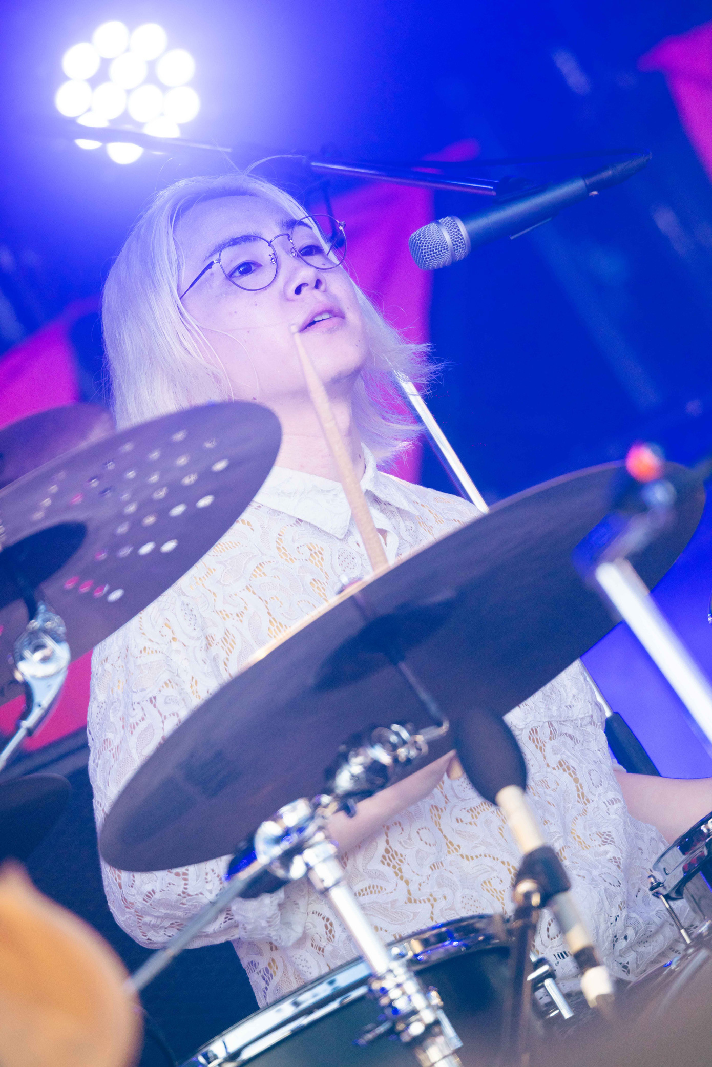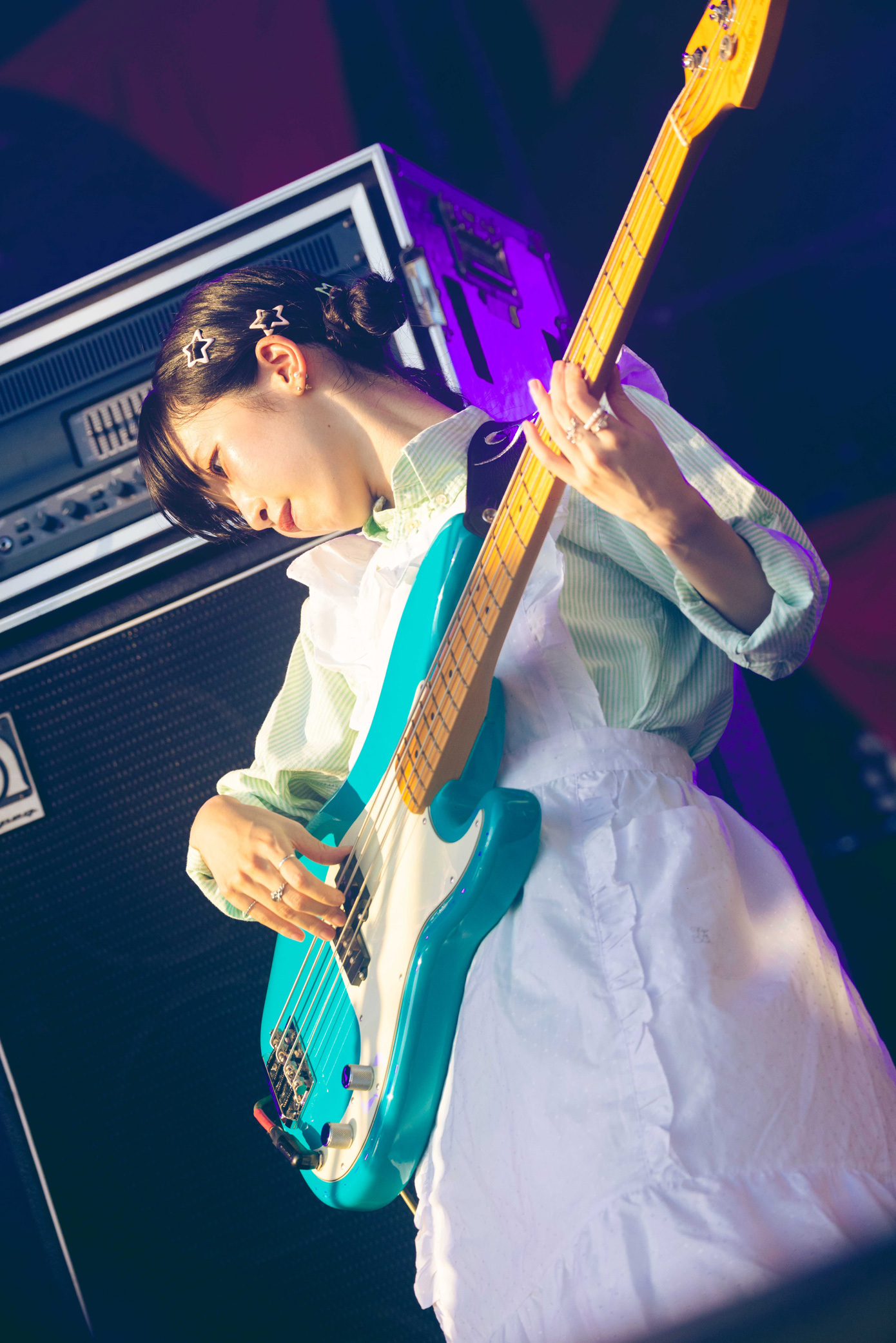麗のハイトーンで鼓膜も刺激したうえ、「『RUSH BALL』、いける?」とたきつけ、次はれんぴ(E.Pf.)の弾むビートと鍵盤が鳴る新曲「私の王子様」へ。ガーリーなボーカルは時に畳みかけ、わずかな狂気もはらむラブソングに思わずだれもが体を揺らす。そして麗がハンドマイクに持ち替え、今度は吐息もまじる歌声で「指髪」を。