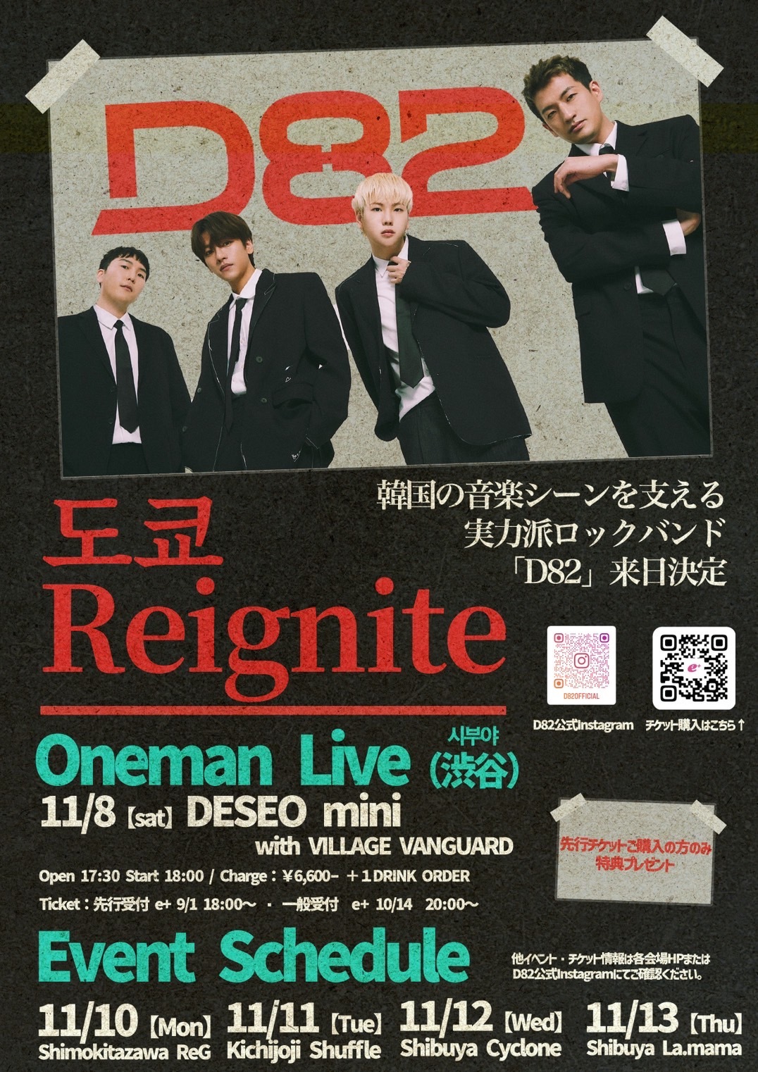 メンバーは、BTS・JINやSUGAのソロツアーをはじめ数々のトップアーティストのステージを支えてきた実力派ミュージシャンや、『愛の不時着』など韓国ドラマ・映画・ミュージカルの音楽現場で活躍してきた精鋭たち。第一線で磨かれた経験が融合し、D82ならではの 重厚で洗練されたロックサウンド が生まれている。