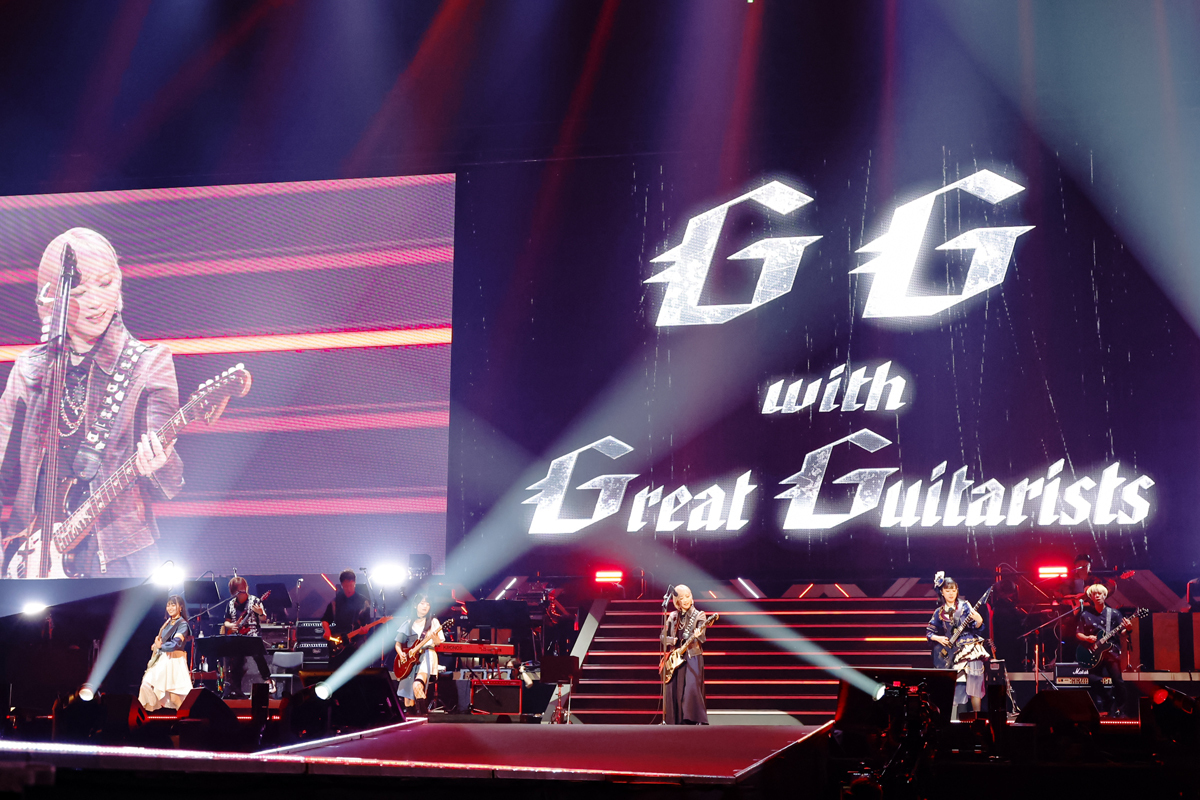 万雷の拍手を浴びながら「もう一曲お届けします」とプレイされたのはアニサマならでは、この日だけのスペシャルセッション。TVアニメ『ソードアート・オンライン オルタナティブ ガンゲイル・オンラインⅡ』オープニングテーマである『GG』をReoNa with GreatGuitaristsとして披露。GGことGreatGuitaristsは、アニサマバンド、そして荒幡亮平、Ommyと共にRoseliaから氷川紗夜(工藤晴香)、MyGO!!!!!から愛音(立石凛)、楽奈(青木陽菜)が参加。それぞれのソロパートで強烈なサウンドを叩きつける。ReoNaの「残弾残らずぶっ放せ!」の叫び声と共にギターの爆音が響き渡る。