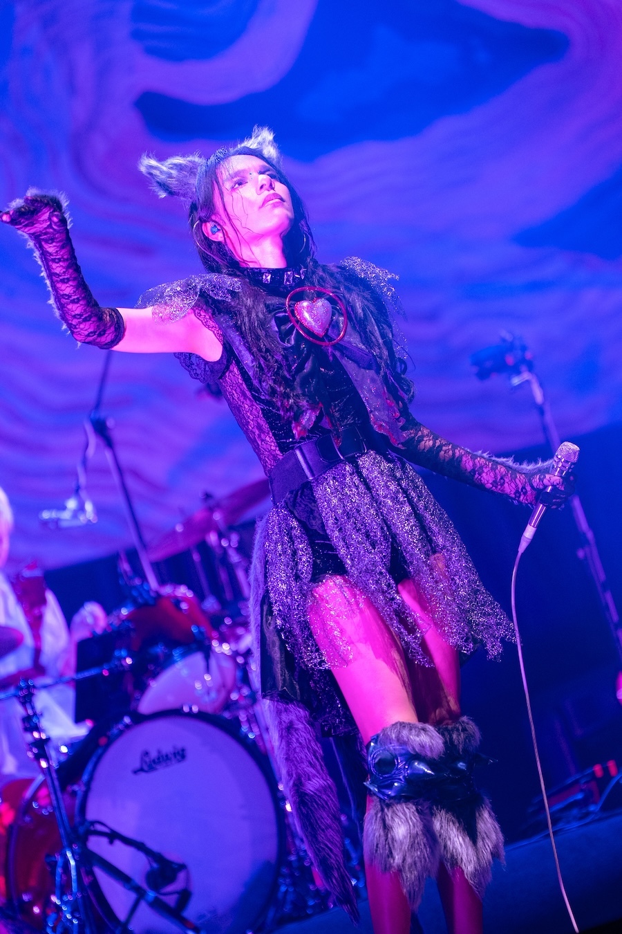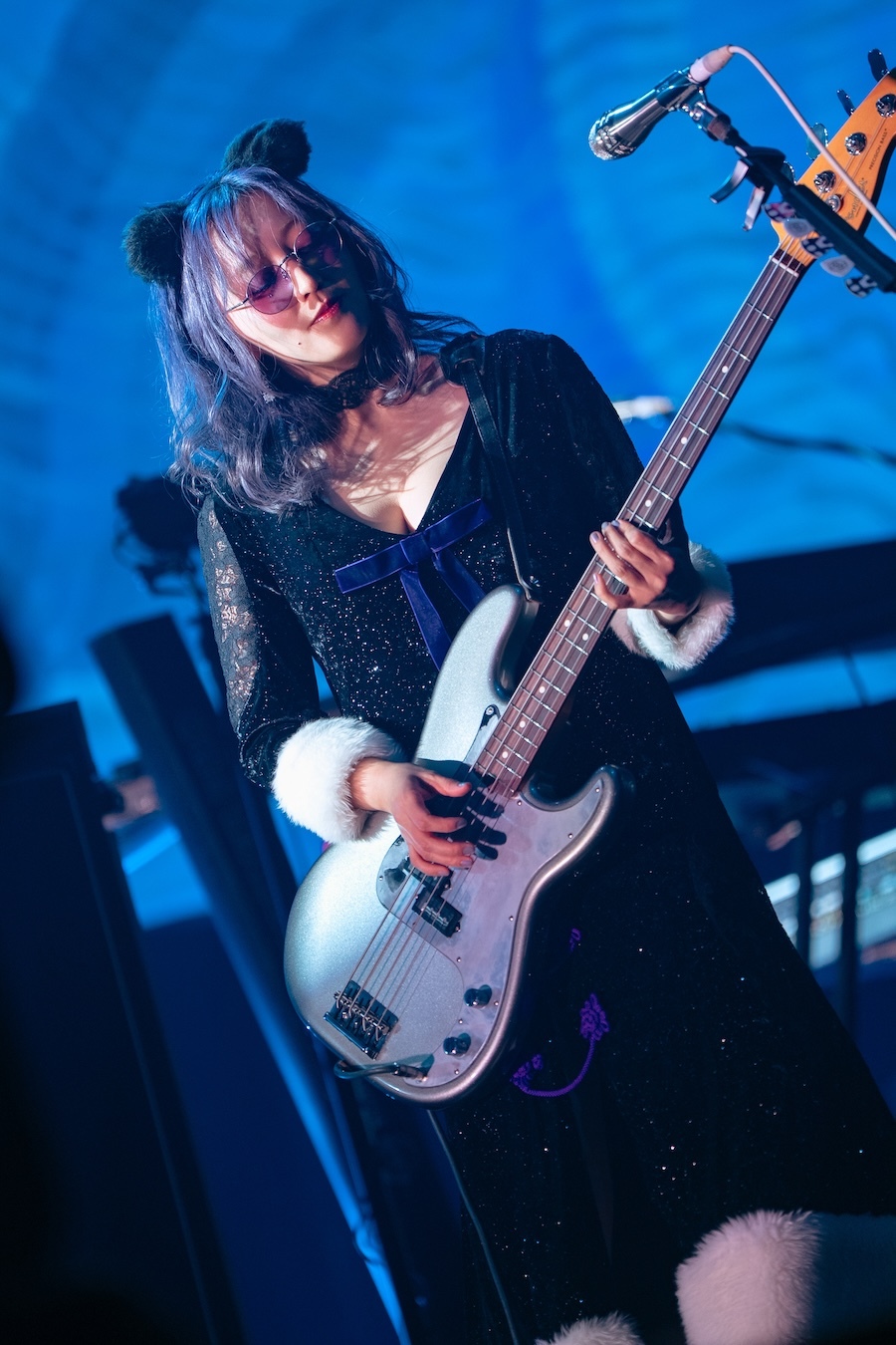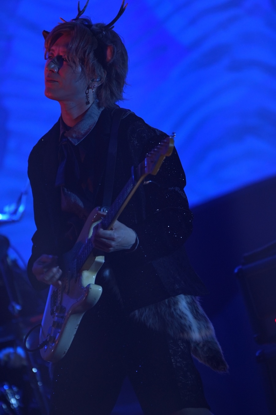 ステージの背景には、アルバム『悪』のビジュアルを大きく掲げた幕が広がり、観客を一気に作品の世界へと引き込む。19時30分、SEに合わせて登場したメンバーは「犬姫」でライブをスタート。ホールツアー『悪』で披露された“qb BEAST”の衣装に身を包み、大型LEDに映し出される細やかな表情とともに圧倒的な存在感を放った。ヴォーカルのアヴちゃんは「謝謝!上海!」と力強く観客に呼びかけ、会場のボルテージは一気に上がっていく。