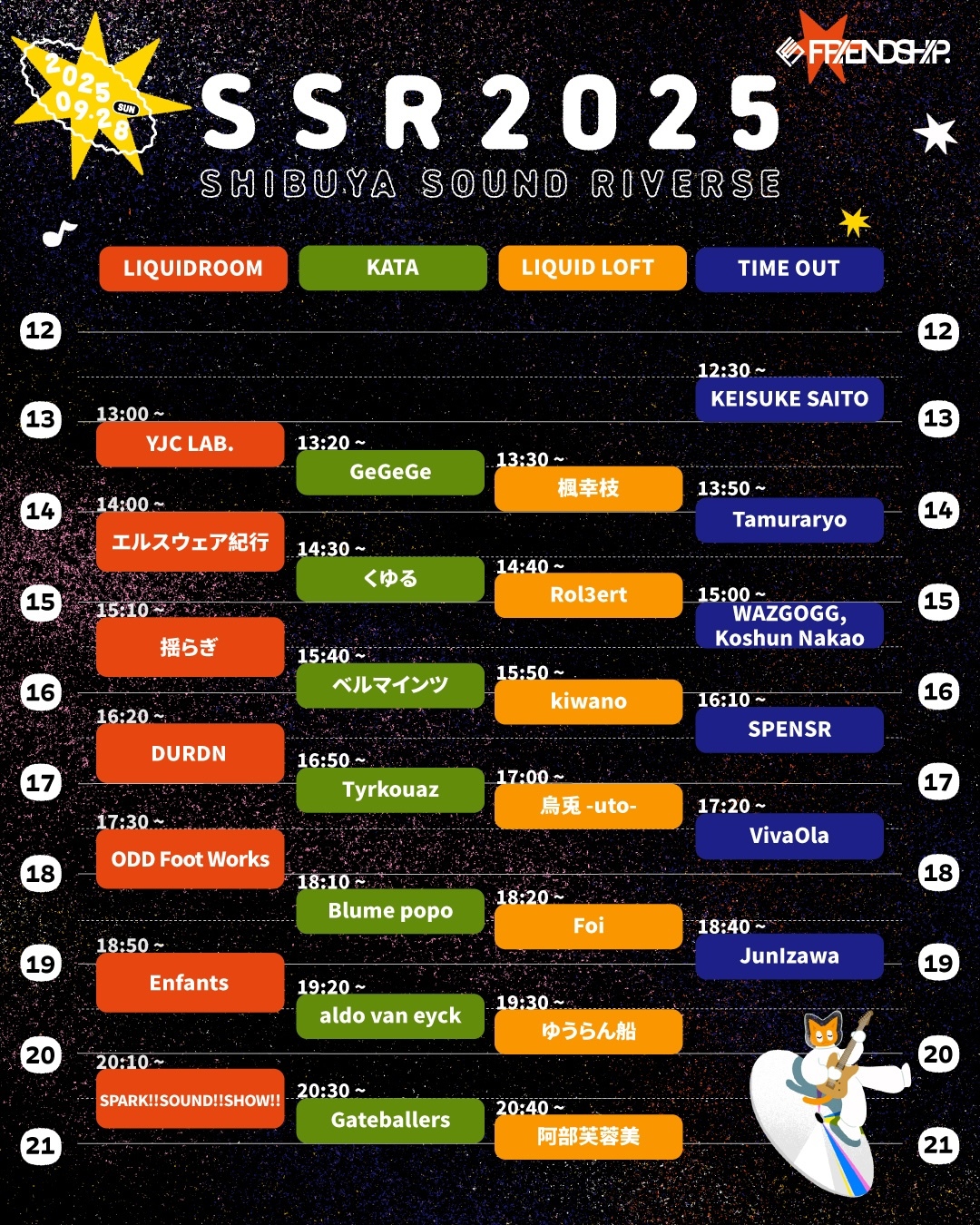 9月28日(日)に恵比寿LIQUIDROOMの全館を使用して開催される、音楽ディストリビューションサービス「FRIENDSHIP.」主催イベント『SHIBUYA SOUND RIVERSE (SSR) 2025』のタイムテーブルが発表された。