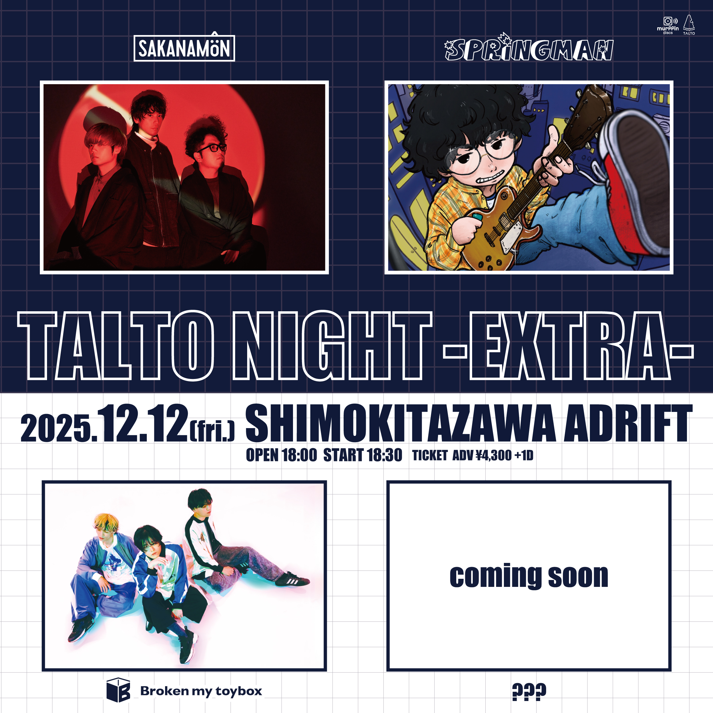 SAKANAMON、マカロニえんぴつ、WON、SPRINGMANらが所属するロックレーベル・TALTOが、ゲストを招いてのイベント『TALTOナイト-EXTRA-』。TALTOからはSAKANAMON、SPRINGMANが出演し、ゲストにBroken my toyboxともう1組ゲストを招いての4マンでの開催を予定している。