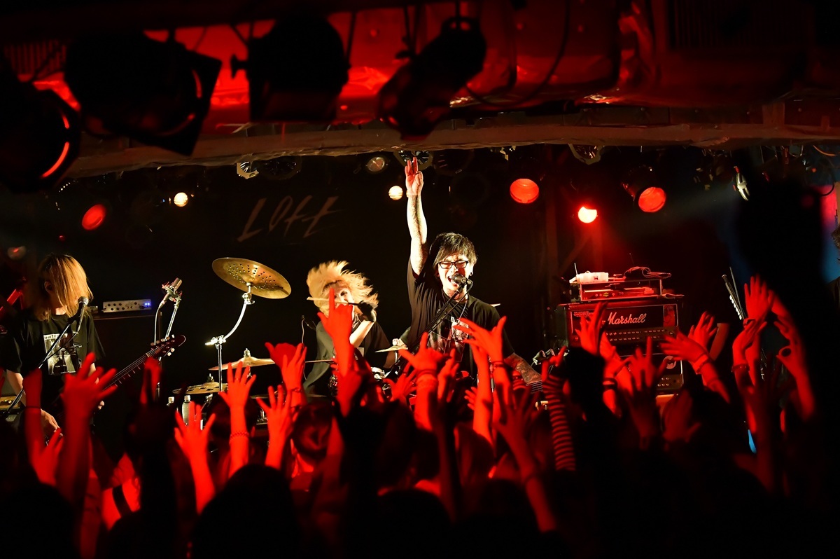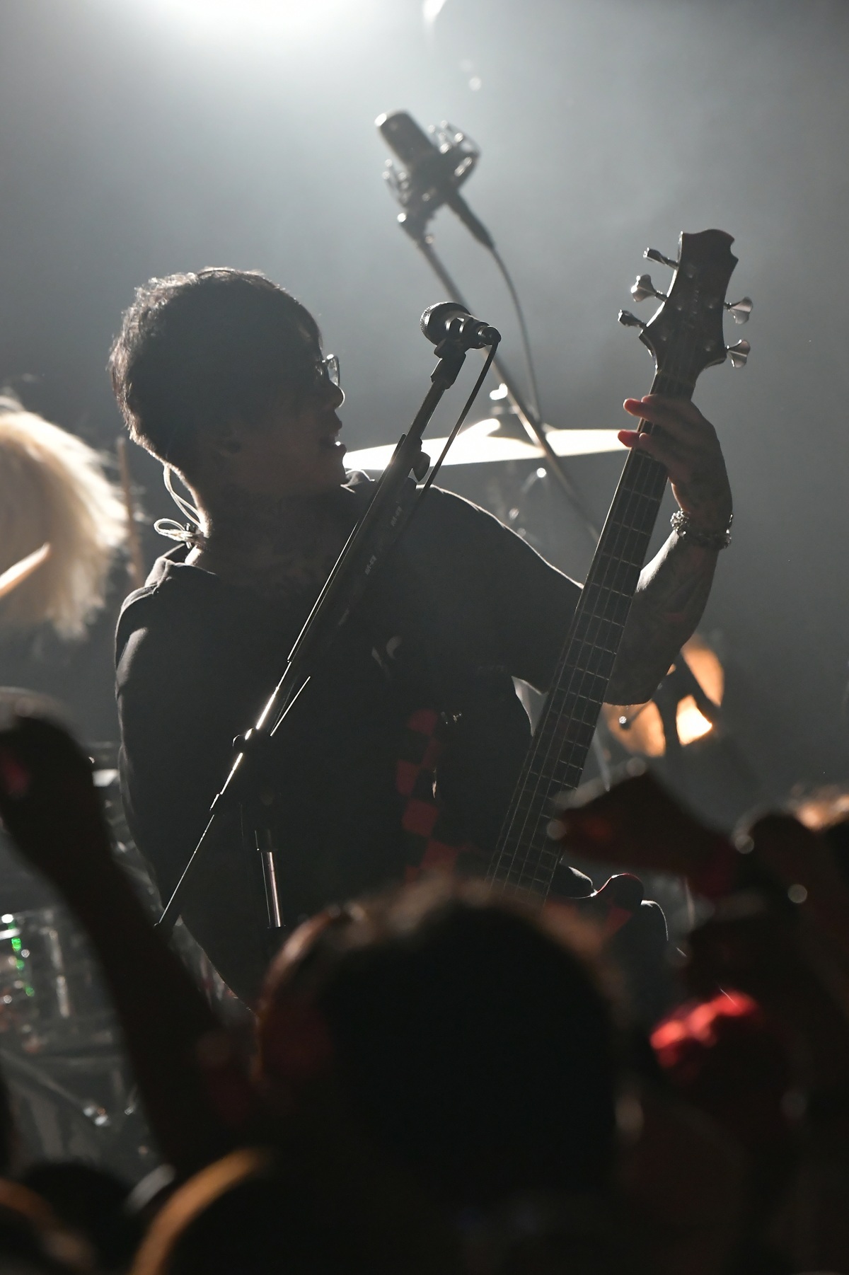 こうして笑いをとりつつも、本人いわくメガネを使用してのライブは何かと“見づらい”ばかりか、汗がたまって目に入りやすくなって“痛い”という二重苦だったらしいのだが、1曲目からアッパーな曲調に煽られていきなり場内がヘッドバンギング祭りとなった「ダーミー城の吸血悪魔を愛したダリア(哀)」(DAMIJAW)を手始めにして、今宵のパフォーマンスではそうしたハンデの類いを感じることは一切なく、むしろこれまで以上にダイナミックで表情豊かな熱演ぶりを拝むことができた。