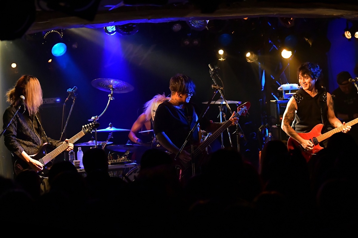 なお、そんなka-yuの生みだす楽曲たちを今回のライブで活き活きと演奏してくれていたのは、ka-yuとはソロ活動を開始した当時からの仲でありギターだけでなくコーラスまで鮮やかに決めてくれる原田喧太(Gt)、元NoGoDの技巧派ギタリストにして個性の強いプレイを展開するKyrie(Gt)、Omega Drippをはじめとする各バンド活動と並行してZIGGYや長渕剛まで多彩なライブ現場でも活躍しているCHARGEEEEEE…(Dr)という超強力布陣。演奏そのものの切れ味はすこぶる鋭いが、それでいてMC中には和気あいあいとした雰囲気をみせてくれるのもこのメンツの面白いところ。