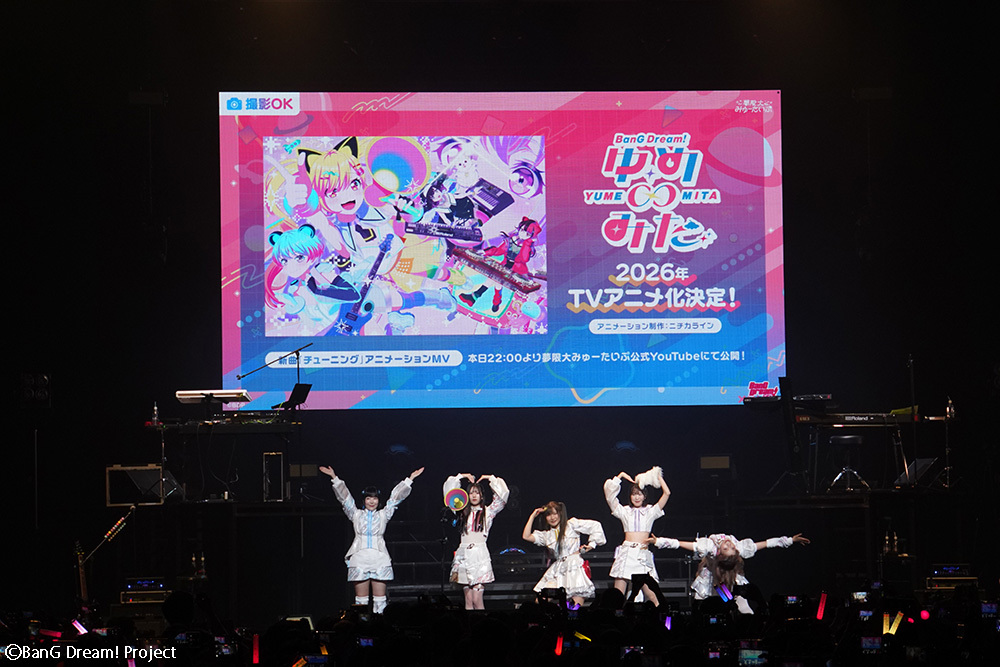 さらに「本日一番伝えたいこと」として、TVアニメ『バンドリ! ゆめ∞みた』の2026年放送決定が伝えられると、割れんばかりの拍手と歓声が場内に響き渡った。さらにここからはスマホでの撮影が解禁され、みんながアニメ化発表ビジュアルと共に5人の記念すべき瞬間を写真に収めていく。そしてアニメが実現したのはスタッフやファンの応援、そして10年間『BanG Dream!』を支えてくれた先輩バンドのみなさんのおかげだと感謝を伝え、ここからさらなる未来を築いていこうと誓った。