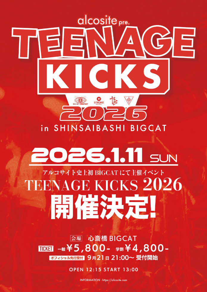 アルコサイトが主催イベント『TEENAGE KICKS 2026』を2026年1月11日(日)に開催することがわかった。