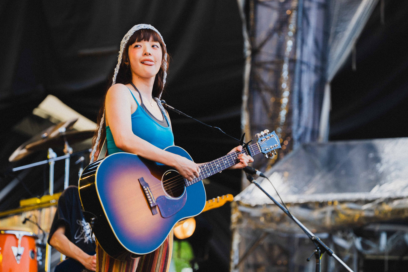 さて2日目も兵庫さんからバトンを繋いでいただき、ここからは私、鈴木淳史が書かせていただきます。12:30・STAGE茶堂。昼真っ盛りの炎天下の中、アコギ1本で丸山純奈が立ち向かう。歌い出しから始まる1曲目「シツレンカ」。てっきり初出場かと思っていたら、2018年にPOLUというバンド名義で出たということ。特筆すべきは地元四国の徳島県出身。四国最大級フェスに出れて夢みたいと話すが、7年もめげずに歌い続けてまた夢のステージを勝ち取ったのは並大抵のことではなかったであろう。高校生の頃から上京しているとも話したが、本当にたくましい限り。故郷を離れ、上京して初めて住んだ街のことを綴った「この街」がさらに説得力を増す。新曲「ラムネ」などオケをバックにハンドマイクで歌う姿も可愛らしかった。