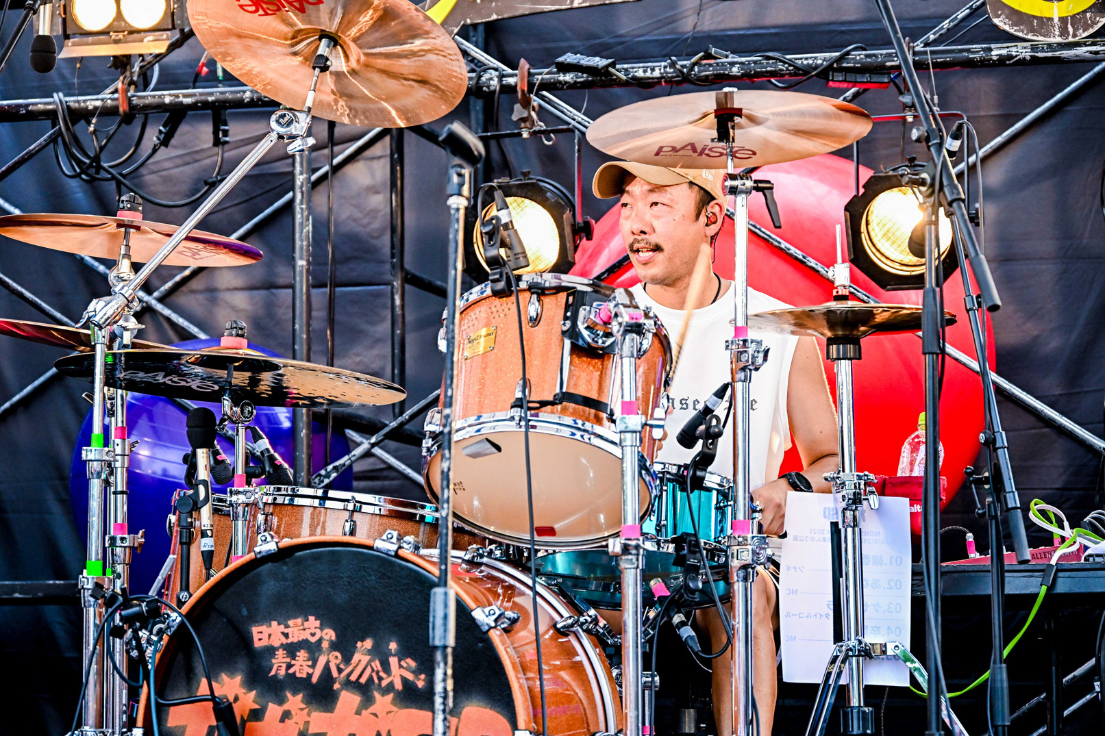 まだサウンドチェックだというのに、この時点で涙腺が崩壊している人は私だけではなかったはずだ。ふと観客エリアの端っこに見覚えのある顔を見つける。古墳シスターズのラース(Dr)だ。先程も書いたように古墳は今年『モンバス』に出場ができなかった。そんな中、初日が終わった22:00から高松市内のライブハウス・TOONICEで『夜更かしMONSTER baSH 2025~古墳シスターズ単独公演~ supported by MONSTER baSH』を開催していた。青春パンクの大先輩であるガガガを見つめる眼差しからは色々な想いを感じた。少しだけ話したが、「来年必ず戻って来ます」と言ってくれたので、心から待ちたい。