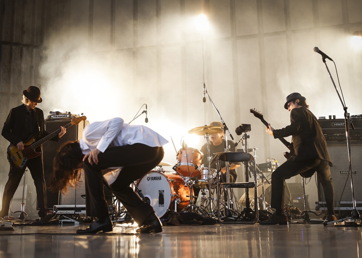 冨永のタイトなドラムで始まり、石森のギターが野音の空気を切り刻むように鳴り響いたのは「奴隷天国」だ。歌だけでなく、「フッ!」「スッ!」といったフェイクがバンドと客席にさらなる気合いを注入していた。宮本が椅子に座り、足を踏みならしながらギターを弾いて始まったのは、「男は行く」だ。足跡を刻むようなずっしりとした演奏が胸に響いた。