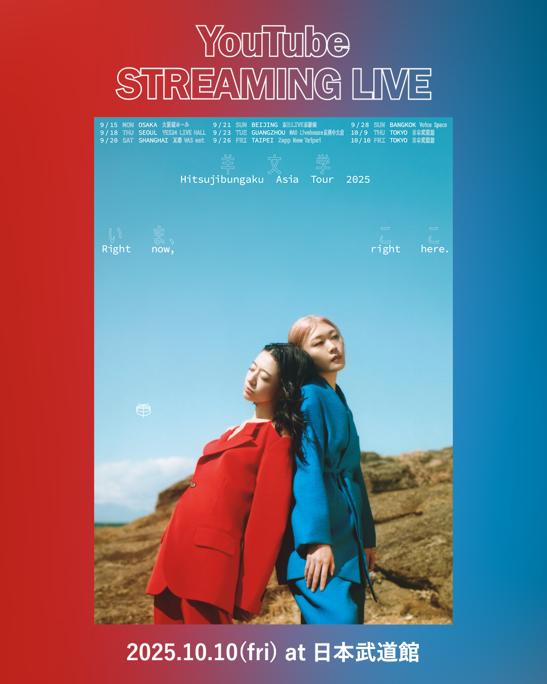 さらに、アルバムのリリースを記念し、現在開催中の8都市をまわるアジアツアー「Hitsujibungaku Asia Tour 2025 “いま、ここ(Right now, right here.)”」のファイナルを飾る日本武道館公演Day2が、YouTube Liveにて一部生配信されることが決定した。