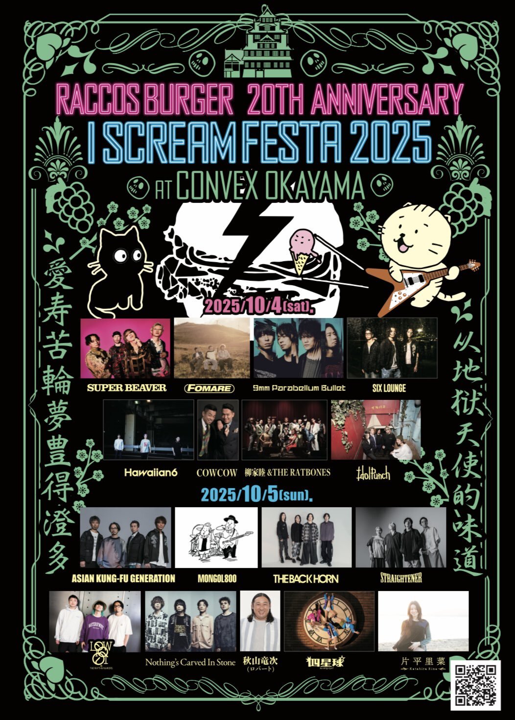岡山・岡山市にある人気ハンバーガーショップ「RACCOS BURGER」が開業20周年を記念し、ロックフェス『I SCREAM FESTA』を開催。10月4日(土)・5日(日)の2日間に、岡山・コンベックス岡山にて音楽の祝祭が繰り広げられる。