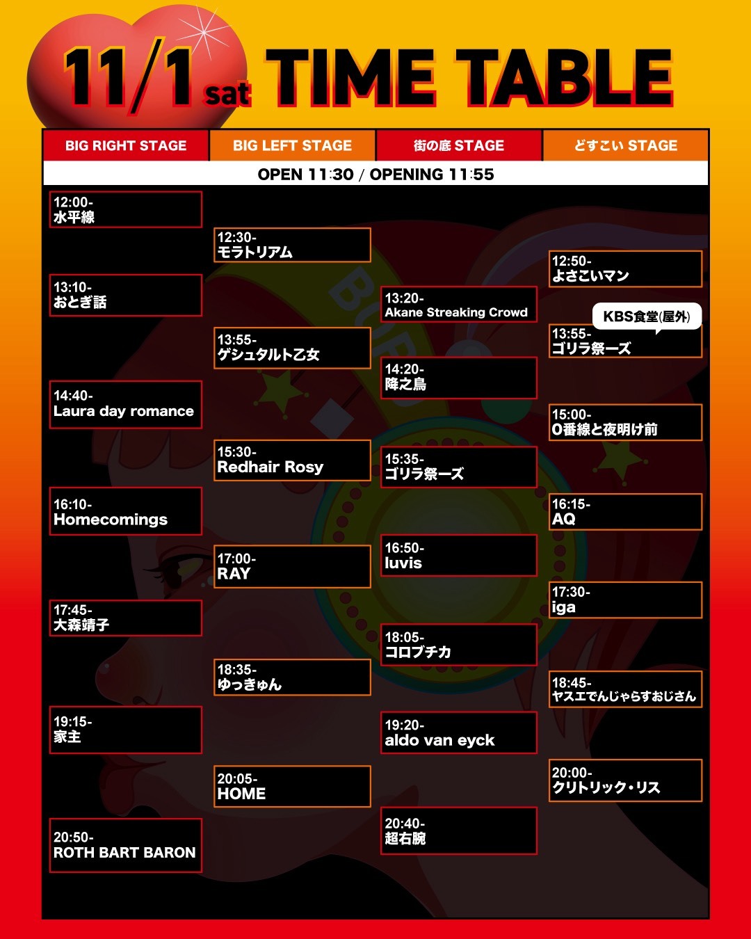 また、KBS食堂(屋外)に特設ステージが登場。11月1日(土)はゴリラ祭ーズによるアコースティックライブ、2日(日)はボギーによるWELCOME ACT、3日(月祝)はFUCKERが出演する。