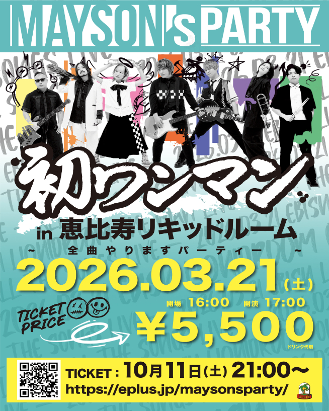 また、自身初となるワンマンライブ『MAYSONʼs PARTY 初ワンマン 全曲やりますパーティー!!』を2026年3月21日(土)に東京・LIQUIDROOMで開催することも明らかに。同ライブのチケットは、イープラスにて11月4日(火)23時59分までオフィシャル最速先行(抽選)が受付中だ。