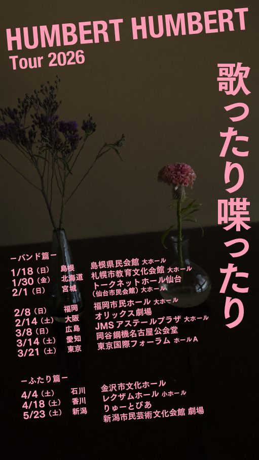 さらに、ツアー2026「歌ったり喋ったり -ふたり篇-」の開催も決定した。石川、香川、新潟の3都市を2人編成で巡る。オフィシャルサイト先行受付が実施されている。