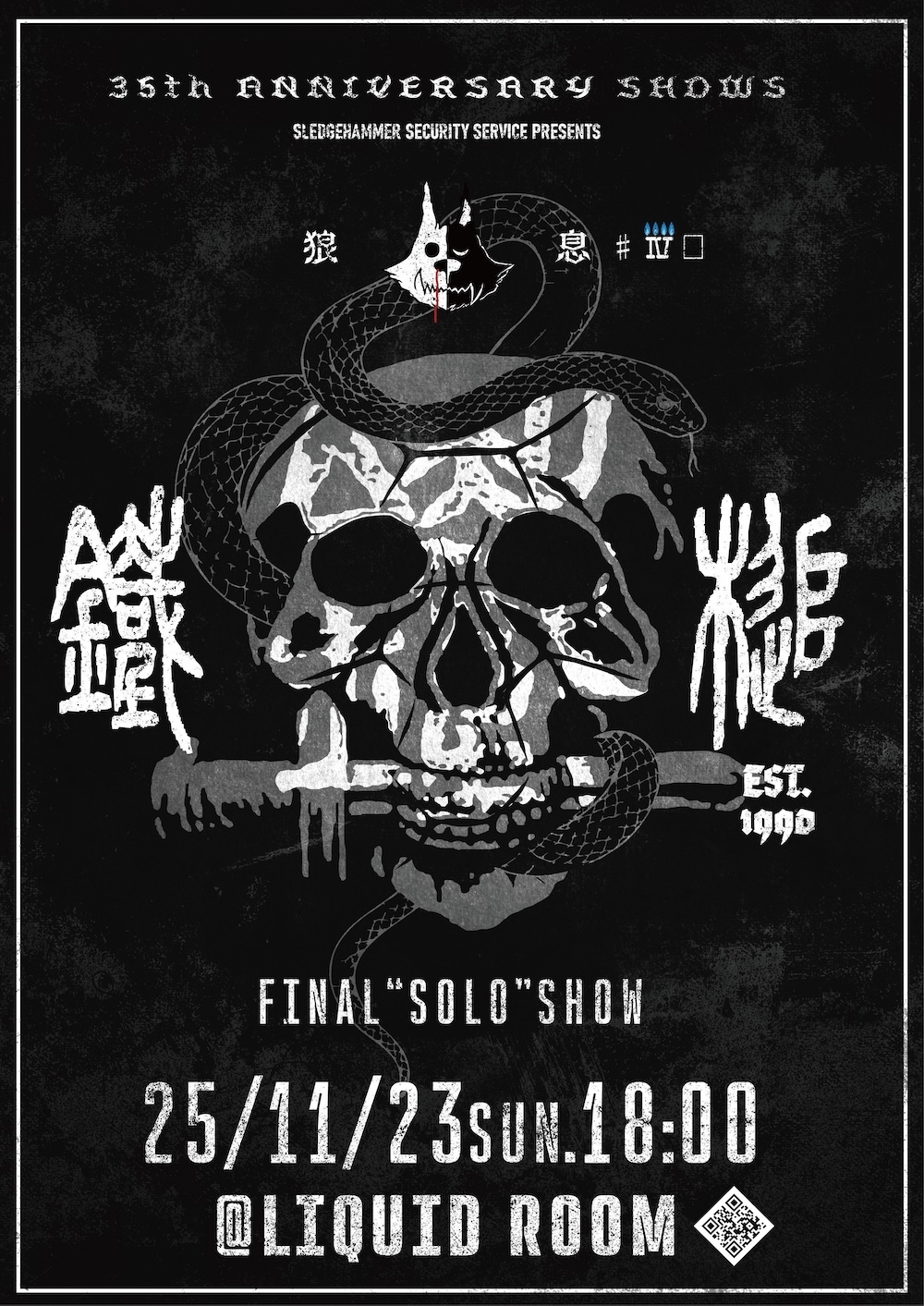 結成35周年を迎えた今年、全4回にわたる自主企画『鐵槌 35th ANNIVERSARY SHOWS 狼息 “ROUSOKU”』に絞り活動中の鐵槌。開催迫るファイナル公演・11月23日恵比寿リキッドルームでのワンマンライブに先駆けて放たれた新曲「狼息」。シリーズタイトルにも冠された本作は、活動初期から一貫して唄われてきた“死生観”を軸に、静謐と激動が交錯する時代を生きる無常を描く。一聴してわかる新たなサウンドアプローチの中に、長い歩みの果てに研ぎ澄まされたバンドの呼吸が息づく。過去を継承しながらも未来へと挑む意志を刻みつけた、鐵槌の現在地を象徴する一曲となっている。アートワークは、数々の鐵槌の作品を手掛ける原田直治によるもの。