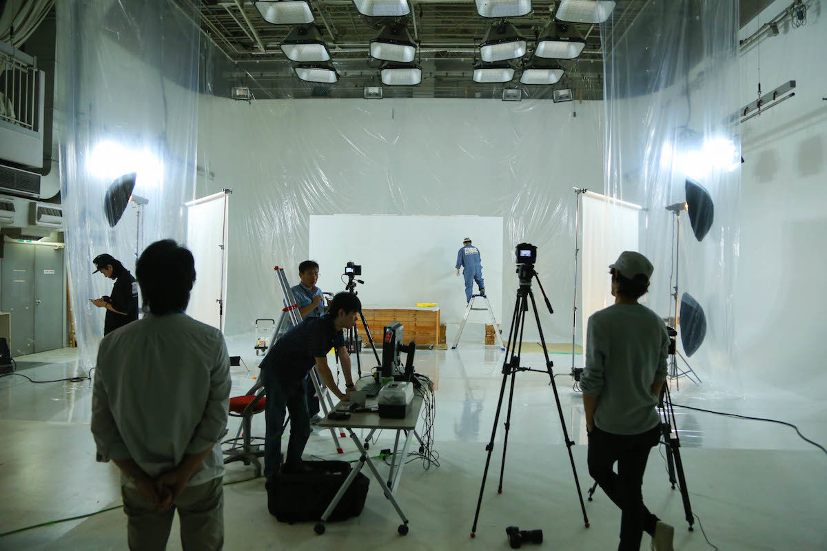 スタジオに到着した筆者を出迎えたのは巨大なパネル。現場が東京郊外に位置するスタジオであったため、連絡を受けたときには「なぜこんな場所で?」と思わないこともなかったのだが、これで納得した。これだけのサイズのパネルを設置し、さらにその周りを養生(汚れないように保護すること)するとなると広大なスペースが必要で、しかも今回はそれを特殊な手法で撮影→ロゴ化するという作業も同時進行で行うわけだ。