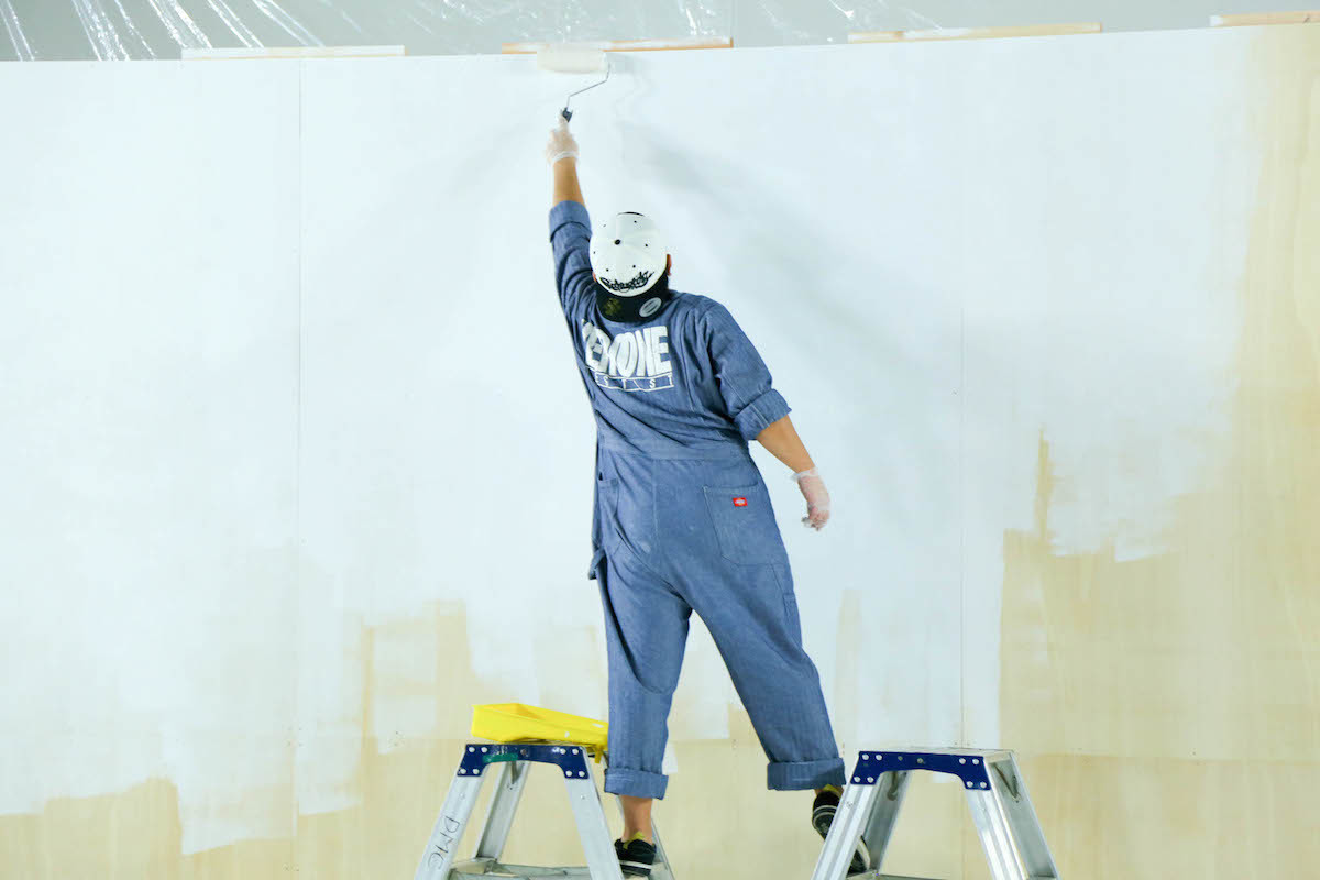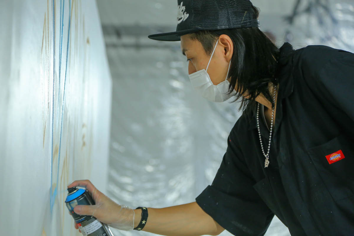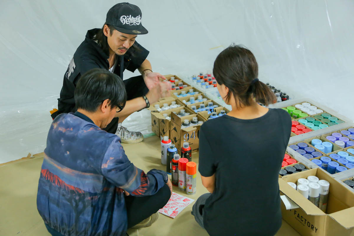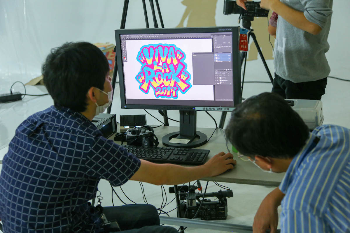 ベースとなる白地を塗っていく間、鹿野とAZIは手元の紙にラフを描きながら、全体像のイメージを膨らませていく。今回、ロゴとして使用するだけではなく、当日の会場で来場者を出迎える巨大パネルとしての役割も果たすため、絵としてのインパクトやどのような意味合いを持たせるかについて話しあうのだ。この会話の中から新たなアイデアが生まれ、AZIがそれを具現化するやり方を模索する。とてもクリエイティヴな空間である。グラフィティを撮影してロゴデータを作成するための超高精細カメラもPCと接続され、スタンバイ完了。
