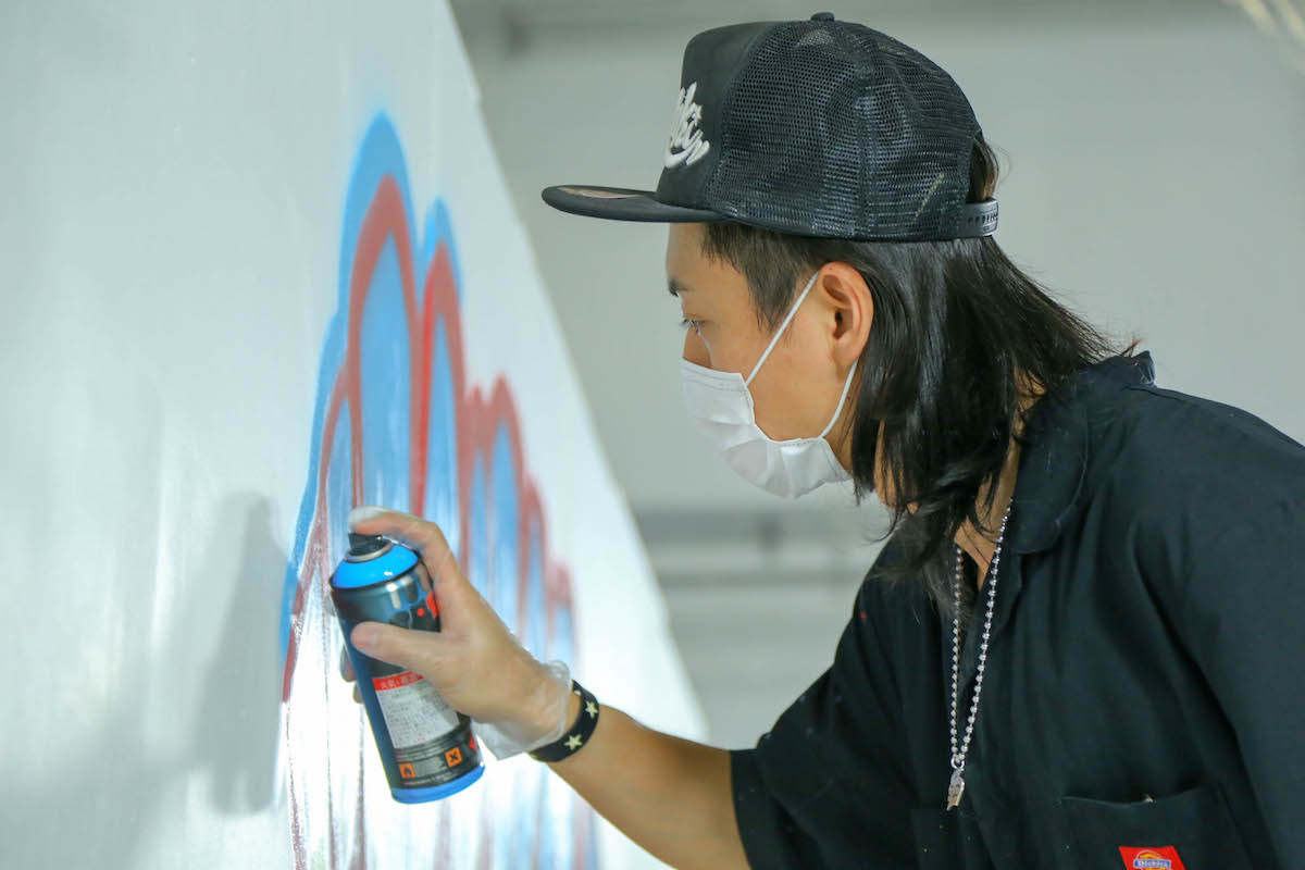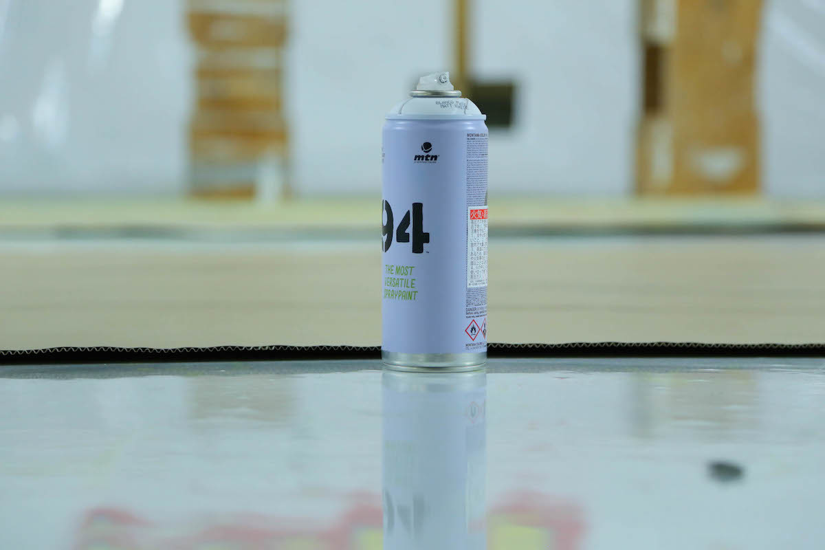 デザインの大枠が決まったところで実際に使用する色をセレクト。スプレー缶の塗料にこんなにカラーバリエーションがあったのか、と驚くほど、赤なら赤、青なら青の中にもたくさんの種類が用意されていた。その中から最適と思われる色をチョイスし、いよいよパネルにロゴを描いていく。……と、ここでも驚きの光景が。下書きともいうべき輪郭を描いていくのだが、全体のサイズ感や文字の形、バランスなど全てフリーハンドで一気に描いていくのだ。スプレーの仕様上、迷ったり止まったりすると塗料が垂れたりムラになってしまうため、勢いと繊細さが高レベルで要求される職人技といえるだろう。