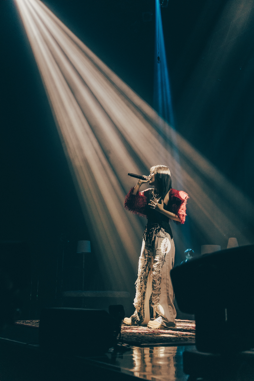 青く仄暗いステージに、重厚で幻想的なサウンドが響き渡る。観客が息を呑んで見守る中、スポットライトが中央を射し、冨岡 愛が姿を現す。