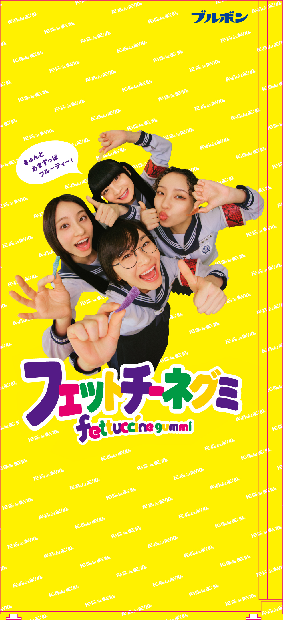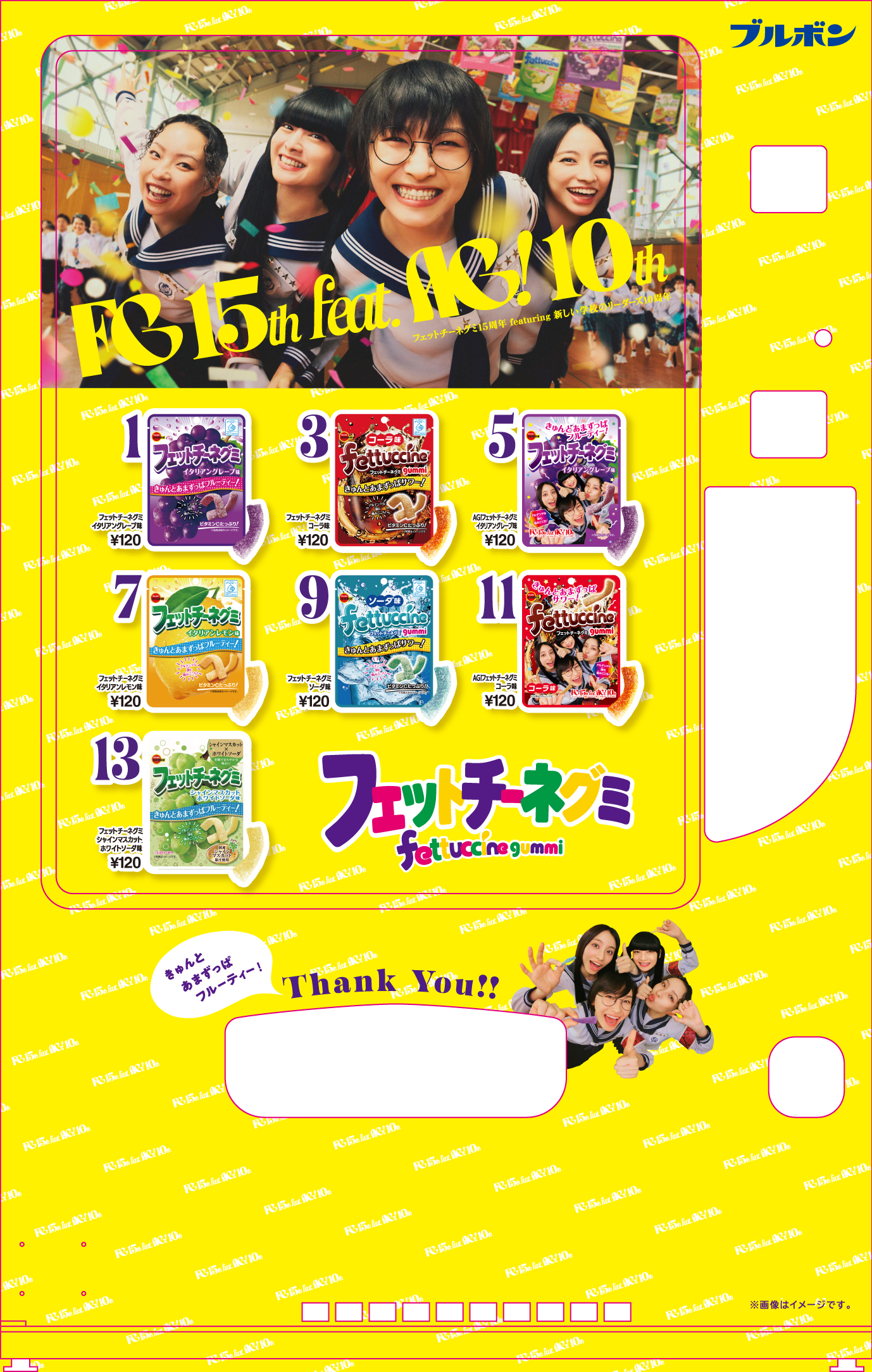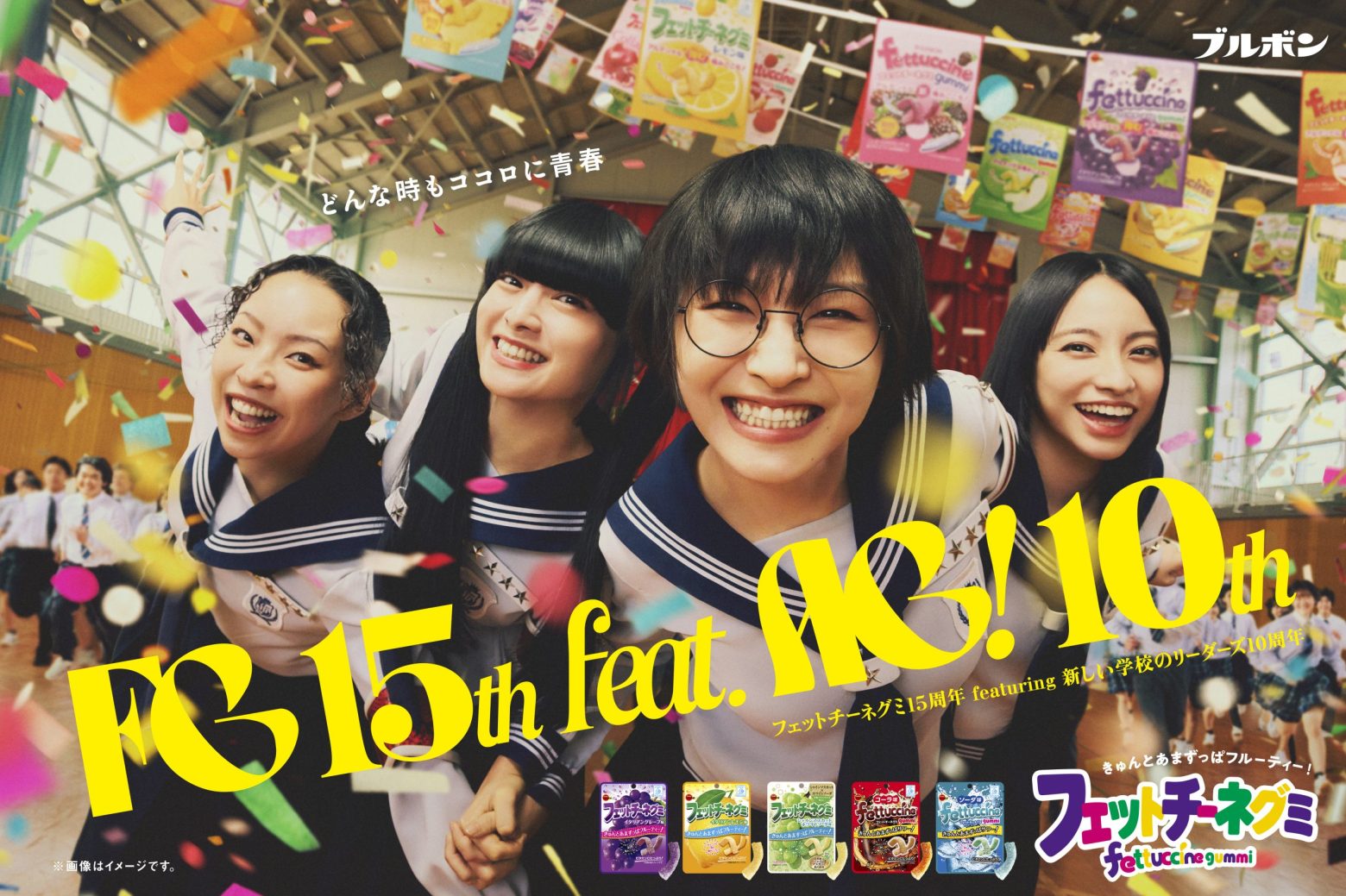 この日のために練習を重ねてきた高校生の姿や、体育館の中央でパワフルなパフォーマンスで高校生を牽引する4人の姿に加え、体育館にフェットチーネグミの歴代パッケージを万国旗のように飾り付けた華やかな装飾も注目点だ。フェットチーネグミ15周年を盛り上げる感動のステージが公開される。
