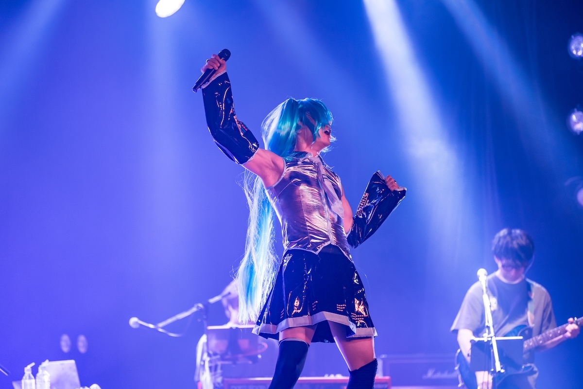 アンコールを求める声と手拍子に応えてステージに戻ってきたバンドメンバーたち。KOOLも現れるのを待っていたら、登場したのは初音ミク!? なんと豪華なシークレットゲストだろう! ……と無邪気に思うはずもなく、ステージ上にいるのはコスプレをしているKOOL以外の何者でもなかった。ネギでどつきたくなる気がしなくもないこの姿で歌い始めたのは、「みくみくにしてあげる♪【してやんよ】」と「1/3の純情な感情」のマッシュアップ。タイトルは「1/3の純情な感情にしてあげる♪」。2曲の大胆な融合、KOOLと初音ミクの強引な融合は、妖しい刺激を噴霧しまくるひと時だった。「かわいいよー!」という黄色い声を上げていた観客は、美的感覚に何らかのダメージを喰らっていた可能性がある。このアイディアは以前から温めていたそうで、今回のライブでついに実現。KOOLは、かなりの手応えを感じたのだろう。「今後も機会があったらやりたい」と歌い終えた後に意欲を示していた。また観る機会があるかもしれない……。