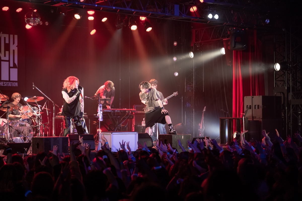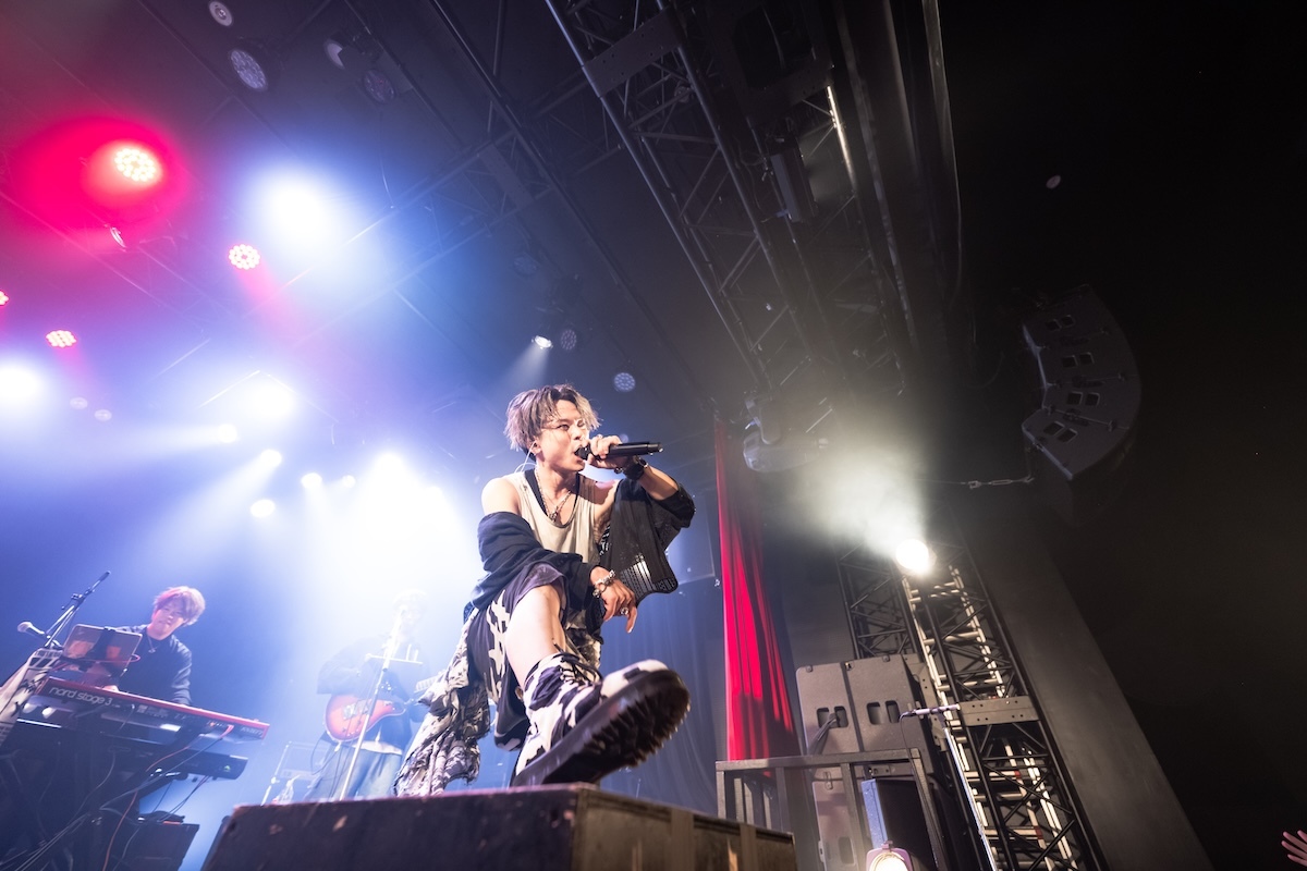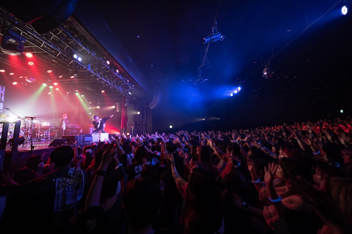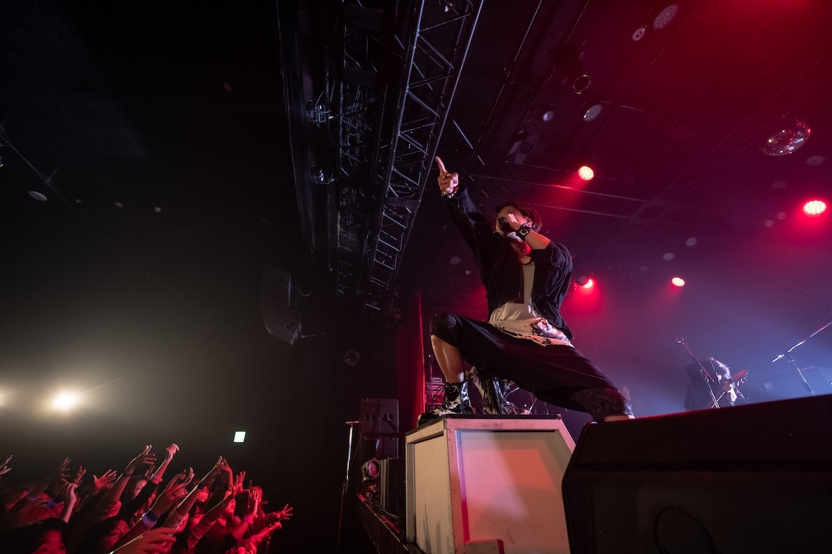 「今日、メイクさんと勝負していて。俺のこの髪型、メイク、崩した方が勝ちか? 崩れなかった方が勝ちか? 名古屋は崩した俺の勝ち。大阪はスプレーの消費を倍ぐらいにして、今日も本気出してる。だから1勝1敗なの。勝たせてくれないか? 先制点は得てる。グジョグジョにしてくれよ!」――重要なミッションを任された観客は、歌声を様々な形で燃え上がらせる役割を担っていた。ダンスビート、爆音、美メロが多彩に浮き彫りにされた「夜咄ディセイブ」「鬼ノ宴」「ジニア」を経て、「名古屋と大阪でun:c.さんに出てもらったんだけど、横浜はこの人を呼びたいと思いまして。呼んじゃってもいいかい?」と問いかけたKOOL。ステージに招き入れられたゲスト・あらきは格闘家のような仁王立ちをして歓声を浴びた。何を問いかけても3つのワード「OK!」「ファッキン!」「ジャパン!」しか返さない彼に呆れたKOOLは、「めんどくせー、こいつ(笑)。ここは任せていいですか? 着替えてくるので」と言って楽屋へ。そしてスタートしたあらきのワンマンショーでは、「ヒビカセ」が披露された。彼のパワフルな歌声を全身に浴びたら、大人しくしているのは無理。無我夢中で飛び跳ねて踊る人々のエネルギーが、フロアをグラグラと揺さぶった。