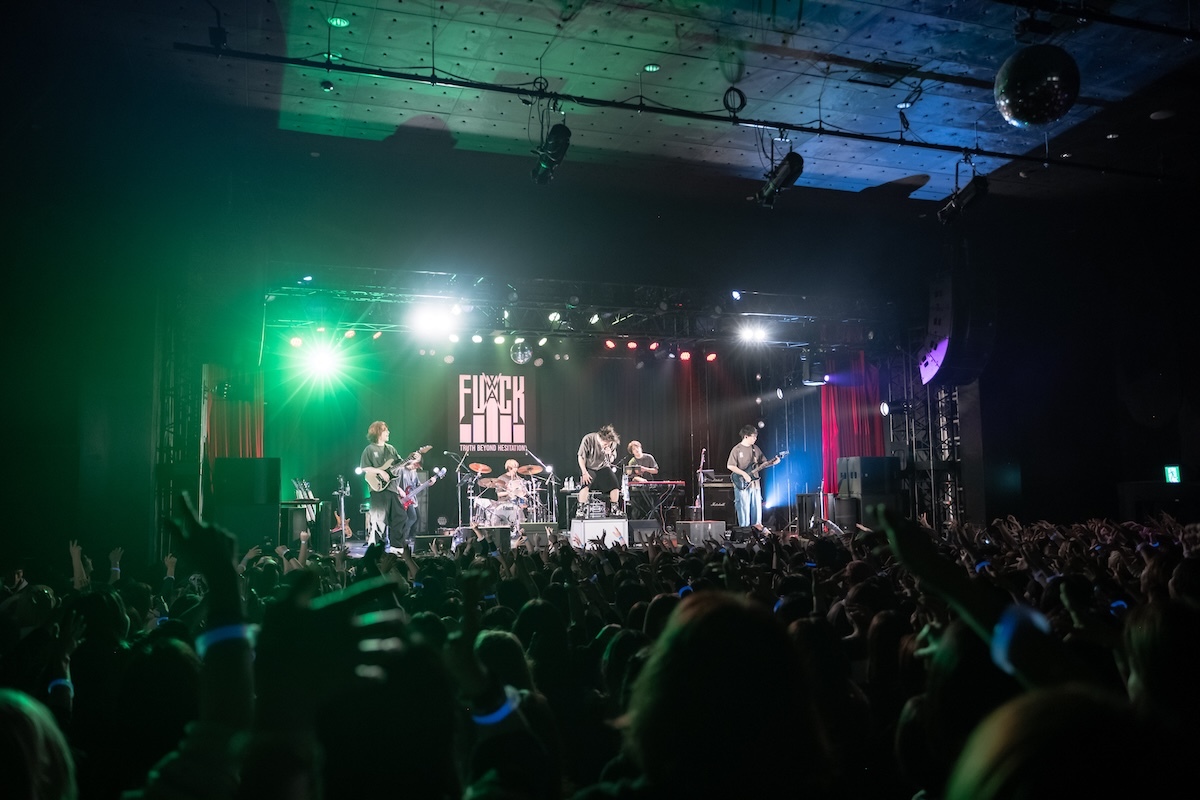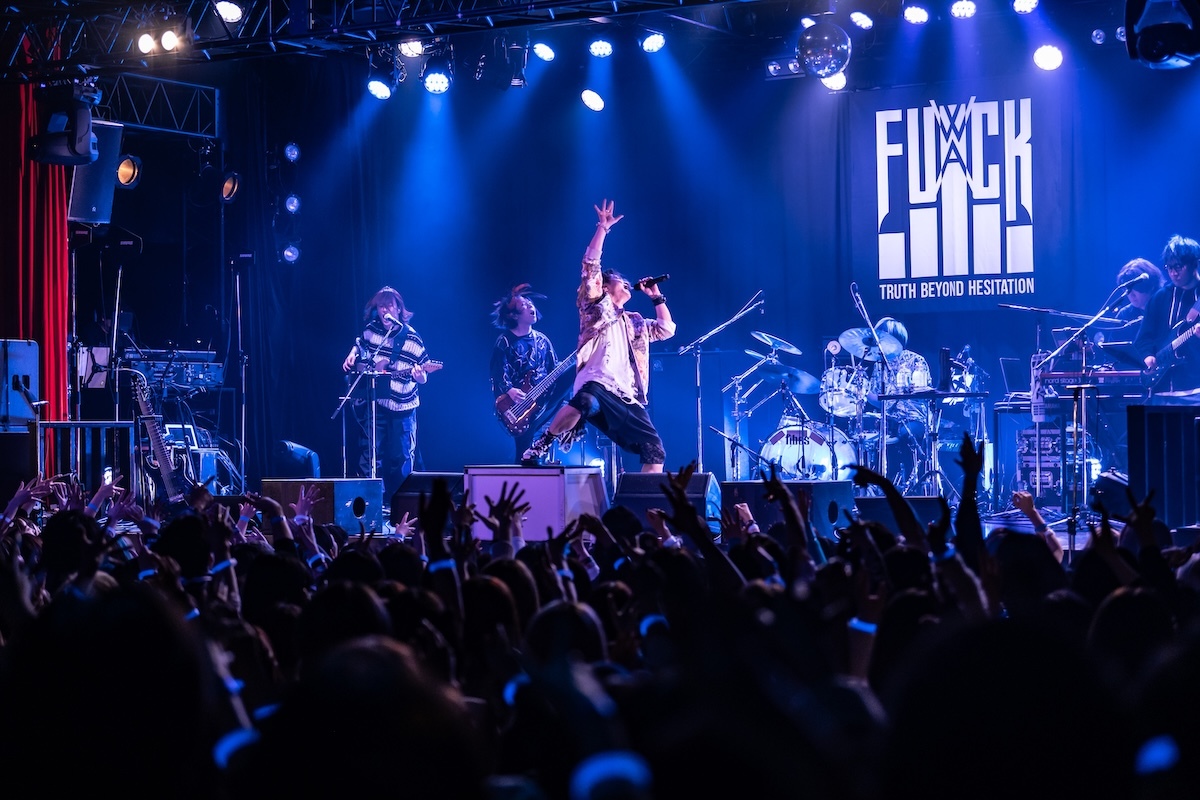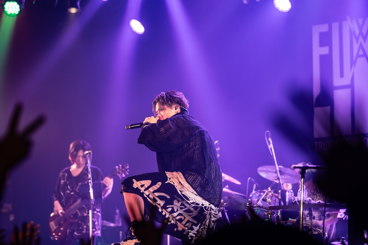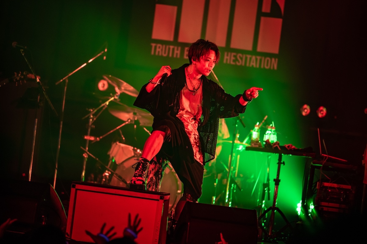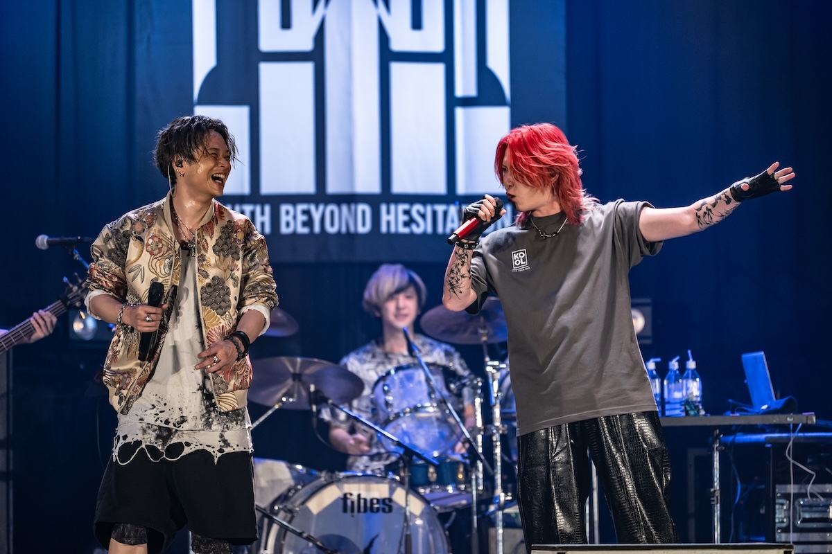 「今日、メイクさんと勝負していて。俺のこの髪型、メイク、崩した方が勝ちか? 崩れなかった方が勝ちか? 名古屋は崩した俺の勝ち。大阪はスプレーの消費を倍ぐらいにして、今日も本気出してる。だから1勝1敗なの。勝たせてくれないか? 先制点は得てる。グジョグジョにしてくれよ!」――重要なミッションを任された観客は、歌声を様々な形で燃え上がらせる役割を担っていた。ダンスビート、爆音、美メロが多彩に浮き彫りにされた「夜咄ディセイブ」「鬼ノ宴」「ジニア」を経て、「名古屋と大阪でun:c.さんに出てもらったんだけど、横浜はこの人を呼びたいと思いまして。呼んじゃってもいいかい?」と問いかけたKOOL。ステージに招き入れられたゲスト・あらきは格闘家のような仁王立ちをして歓声を浴びた。何を問いかけても3つのワード「OK!」「ファッキン!」「ジャパン!」しか返さない彼に呆れたKOOLは、「めんどくせー、こいつ(笑)。ここは任せていいですか? 着替えてくるので」と言って楽屋へ。そしてスタートしたあらきのワンマンショーでは、「ヒビカセ」が披露された。彼のパワフルな歌声を全身に浴びたら、大人しくしているのは無理。無我夢中で飛び跳ねて踊る人々のエネルギーが、フロアをグラグラと揺さぶった。