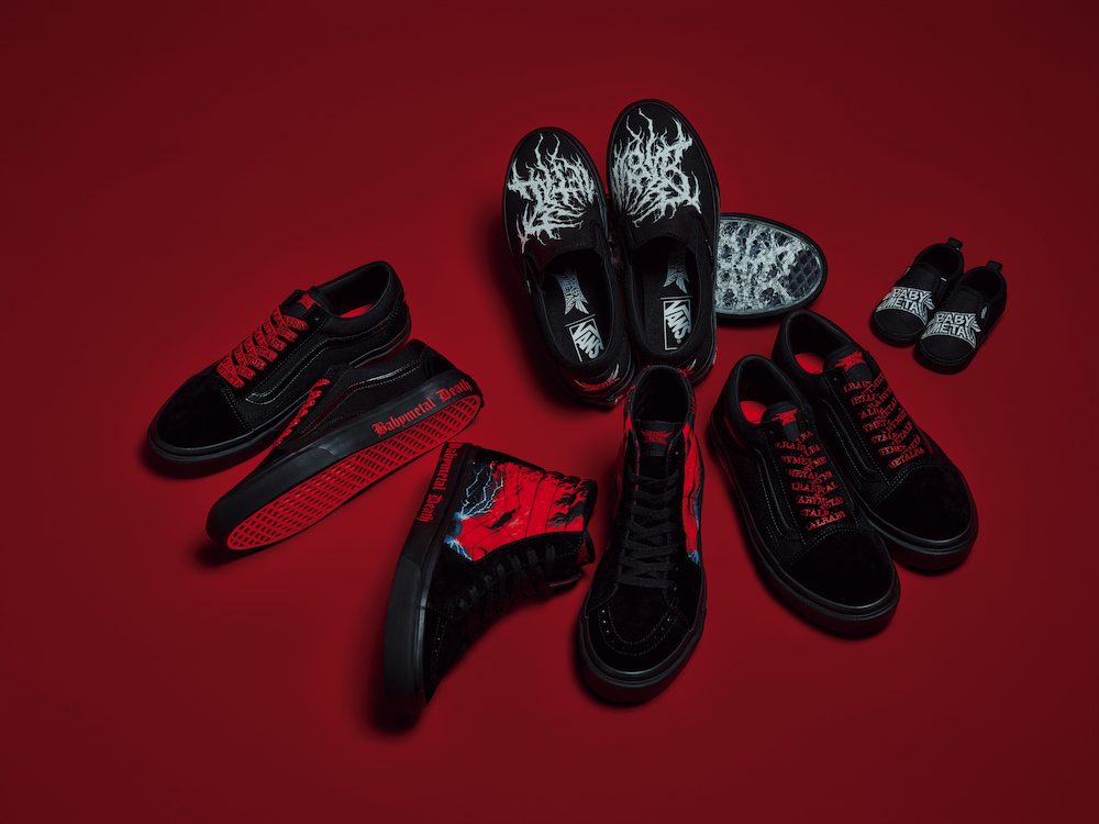 Vansを代表するクラシックモデル「OLD SKOOL」「SK8-HI」「SLIP-ON」をベースにした本コレクションは、いずれもBABYMETALをイメージする赤と黒を基調にしたアイテムがラインナップ。