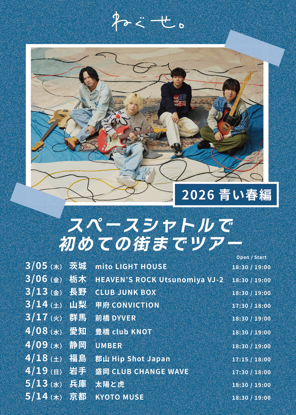 ねぐせ。が、3月よりワンマンツアー「スペースシャトルで初めての街までツアー 2026 青い春編」を開催することを発表した。