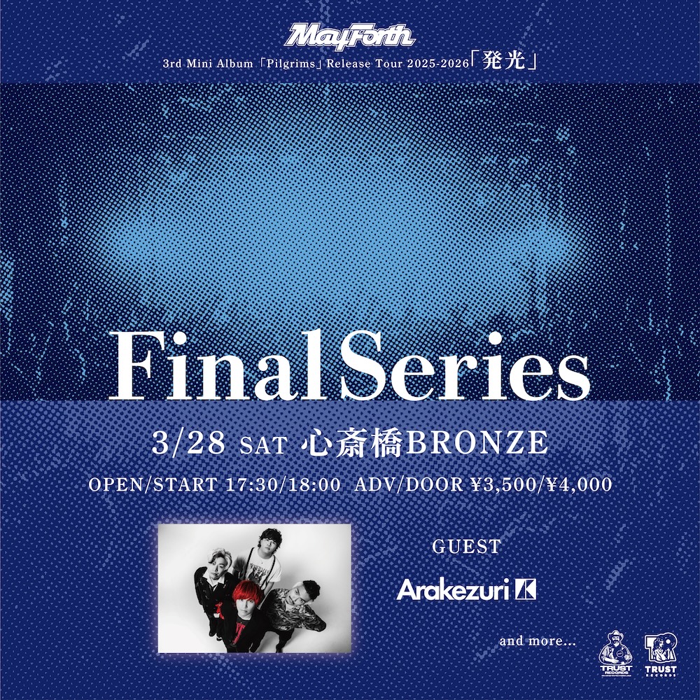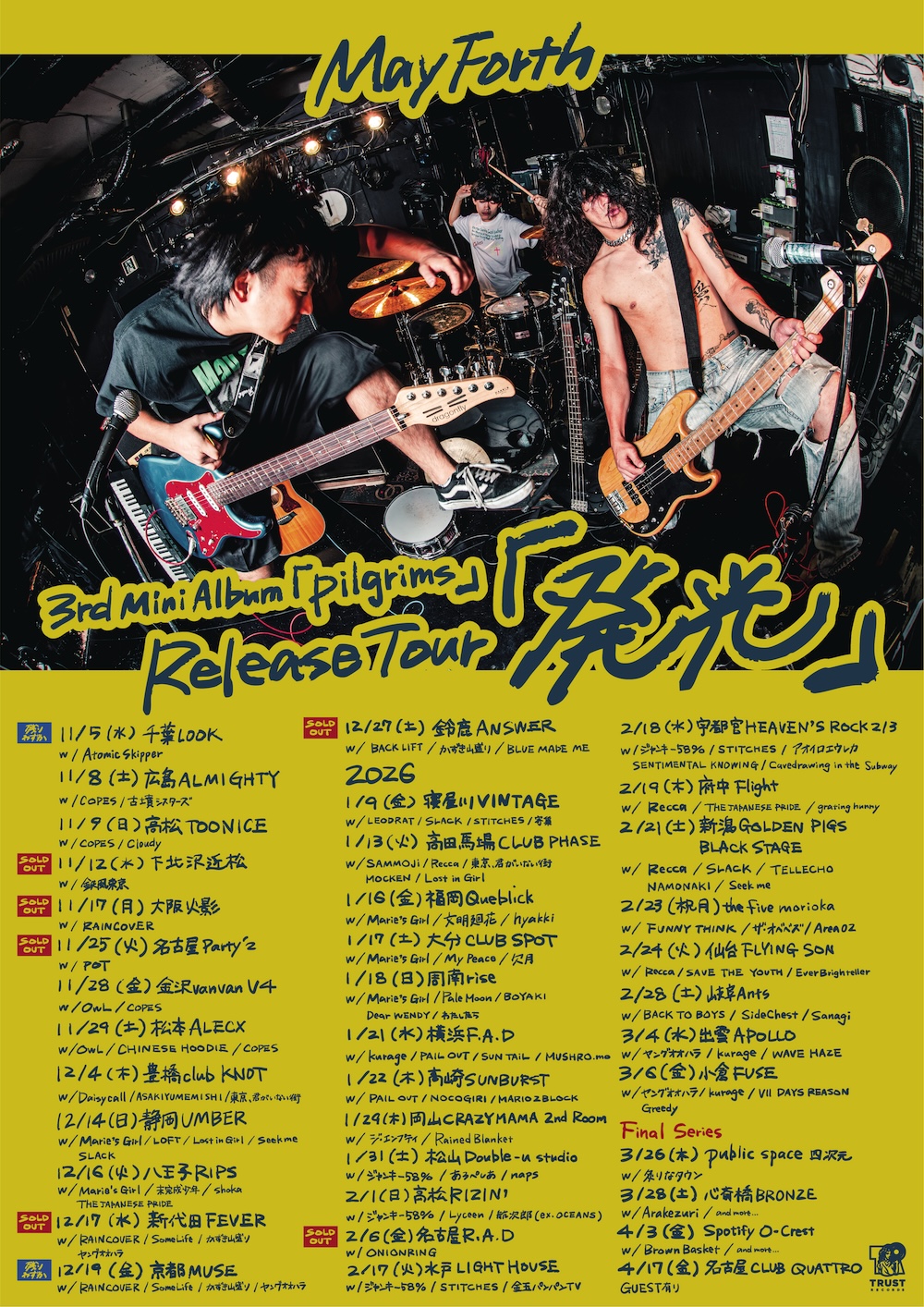 TRUST RECORDSに所属する名古屋発ロックバンドMay Forthが、3rd Mini Album “Pilgrims”を掲げて全国を30会場以上を巡るRelease Tour「発光」のファイナルシリーズの第1弾ゲストアーティストを発表した。
