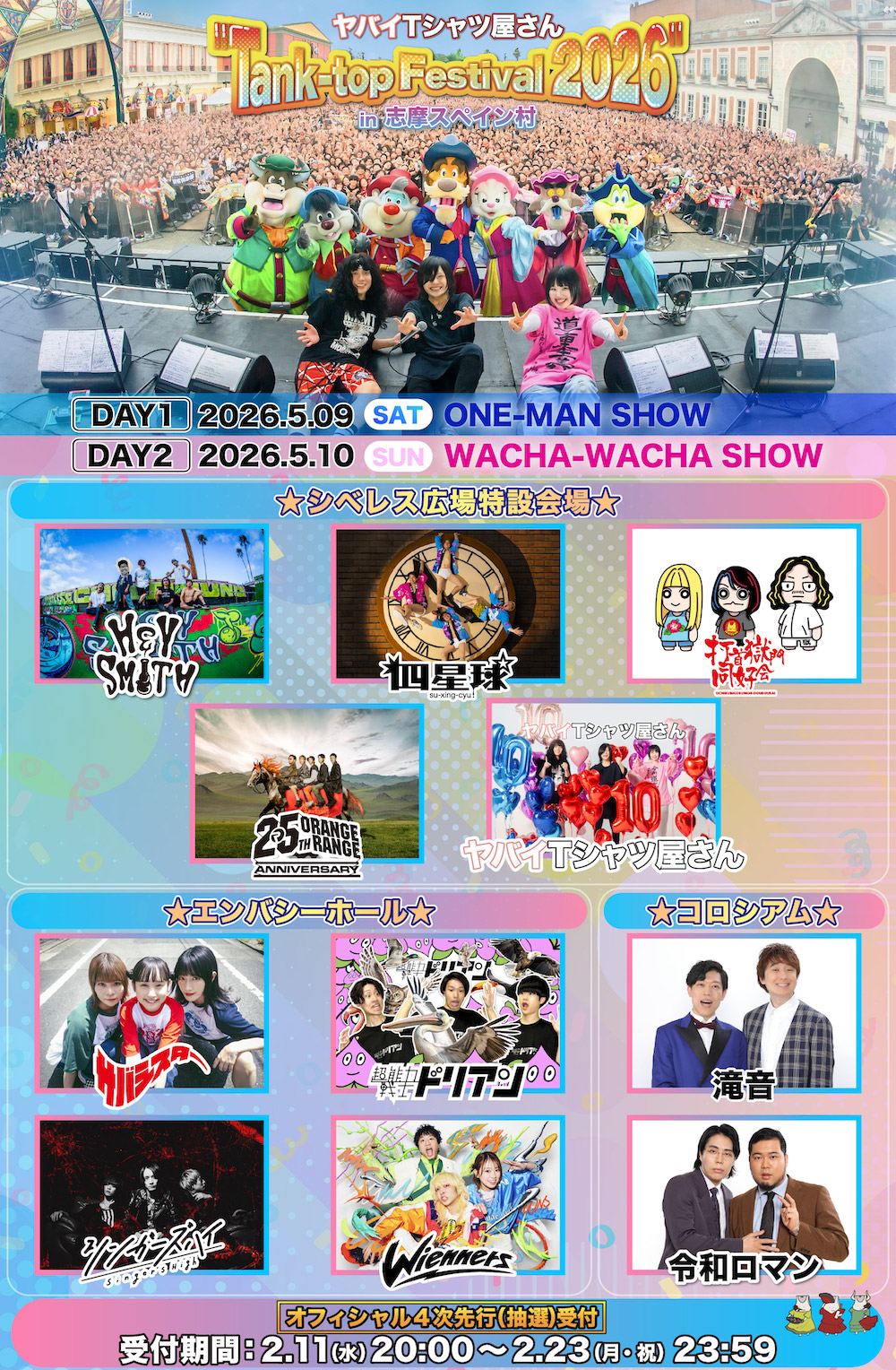 同会場での開催は3年連続。初日の5月9日は”ONE-MAN SHOW”としてワンマンライブを実施し、2日目の5月10日は”WACHA-WACHA SHOW”と題したフェス形式で行われる。今回より規模を拡大し、シベレス広場特設会場、エンバシーホール、コロシアムの3会場を使用。ORANGE RANGEや令和ロマンなど、音楽からお笑いまで多岐にわたるラインナップが集結する。