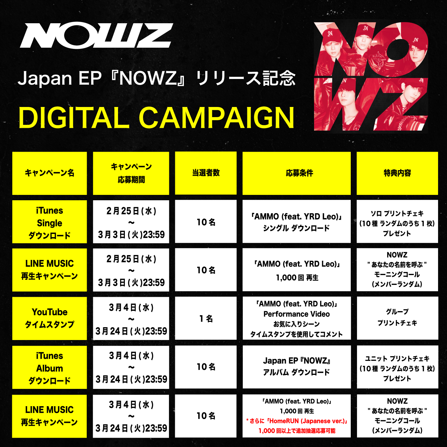Japan EP「NOWZ」のリリースを記念し、フィジカル商品は各CDショップにて販売中。店舗別限定特典トレーディングカードや、一部店舗限定でのサイン入りポスター進呈キャンペーンなどが実施されている。さらに本日より、YouTubeタイムスタンプ / iTunesアルバムダウンロード / LINE MUSIC再生キャンペーンがスタート。限定チェキやメンバーのボイス特典など、様々な特典が付随するデジタルキャンペーンも開催中だ。詳細は各キャンペーンサイトにて確認できる。