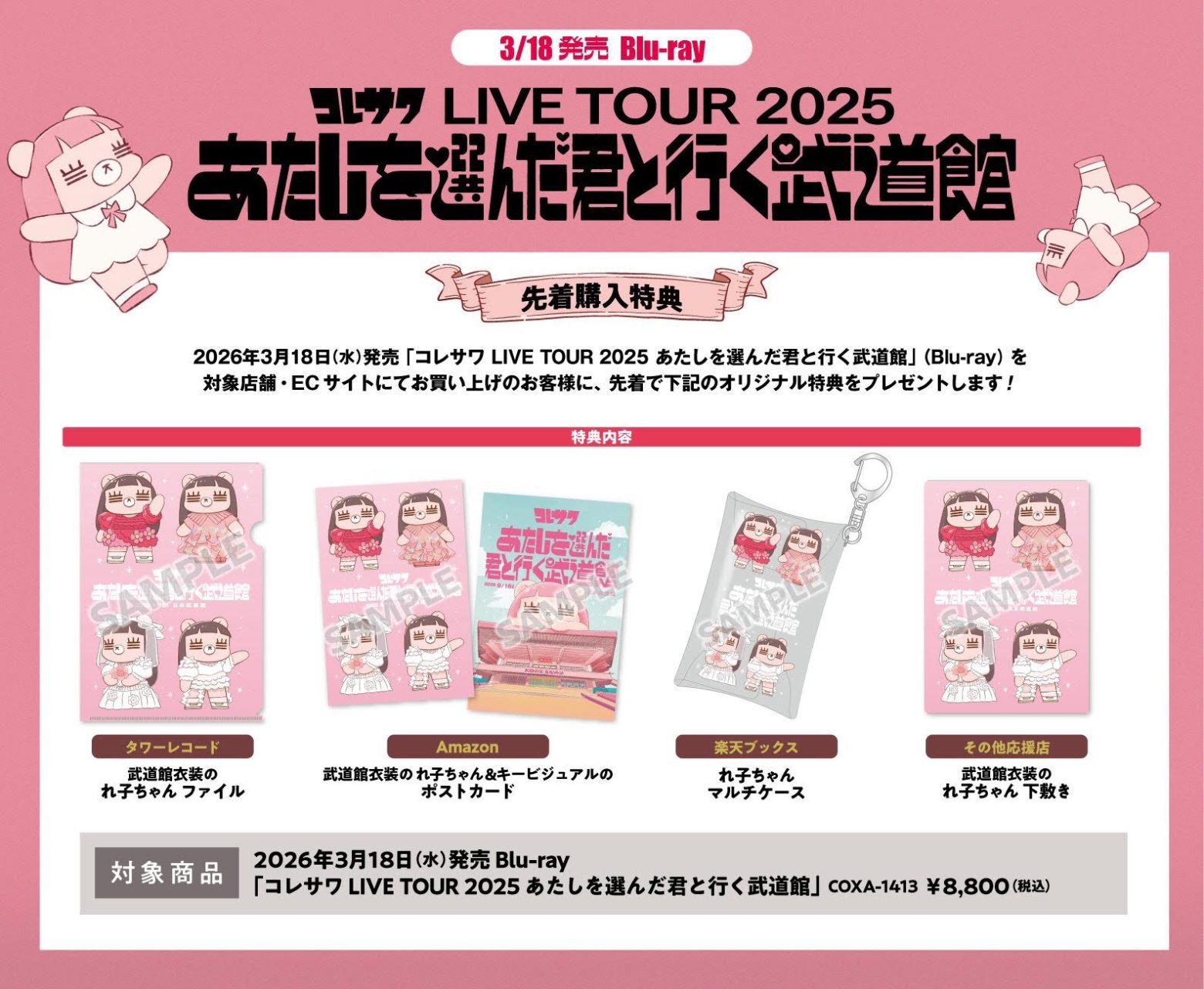 また、同日にはライブBlu-ray「コレサワ LIVE TOUR 2025 あたしを選んだ君と行く武道館」も発売。全25曲のパフォーマンスをフルパッケージで収録し、代表曲「たばこ」や「元彼女のみなさまへ」に加え、武道館Ver.のアレンジなども網羅されている。本編にはコレサワ、ひぐちけい、ウチボリシンペによるオーディオコメンタリーが収録されるほか、特典として「武道館のおっきいれ子ちゃんステージアクスタ」が封入される。