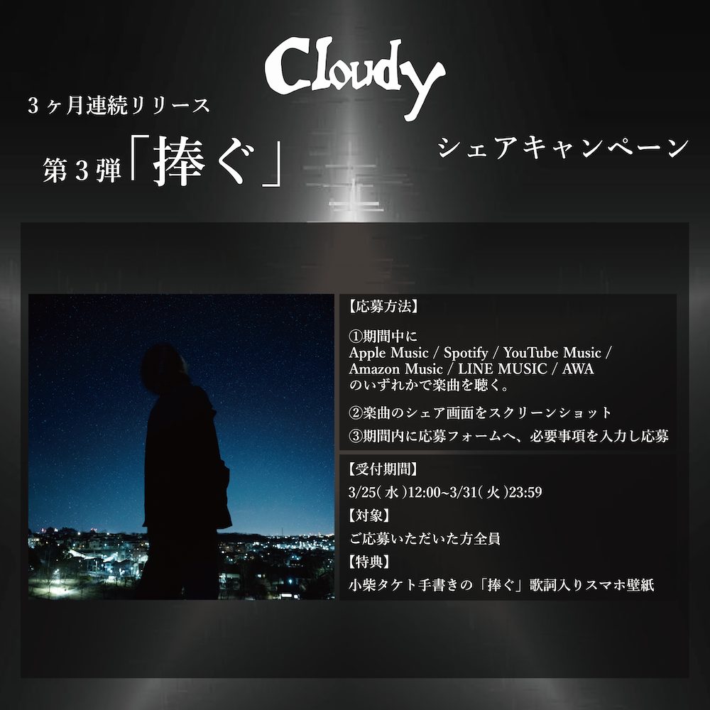 2026年1月より3ヶ月連続シングルリリース企画を展開しているCloudyが、その最終回となる第3弾楽曲「捧ぐ」のミュージックビデオを公開した。