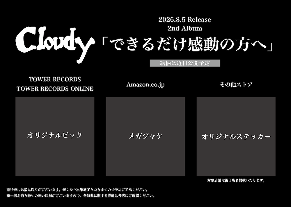 Cloudyが、2ndアルバム「できるだけ感動の方へ」のリリースを発表した。あわせて、対バンおよび初となるワンマンツアーを全15会場で開催する。ツアーファイナルとなる渋谷CLUB QUATTRO公演が最速先行でソールドアウトしたことを受け、ワンマン編の初日として10月1日に渋谷WWW Xでの追加公演を行うことも決定した。