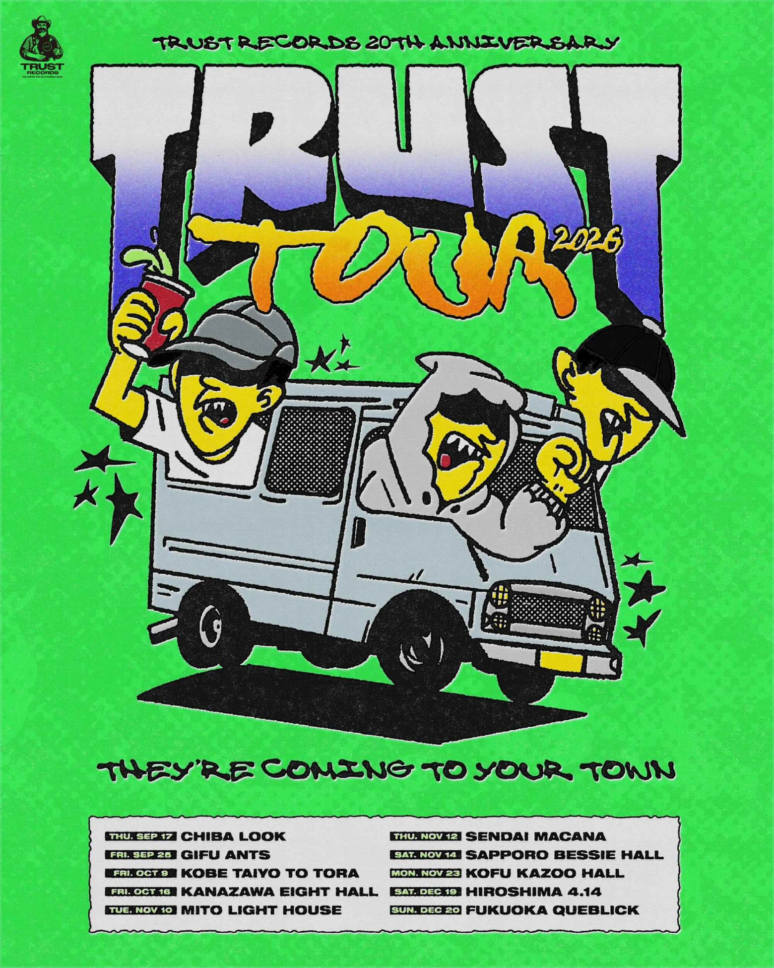 名古屋のインディーズレーベルTRUST RECORDSが、2026年に設立20周年を迎える。これに伴い、過去最大規模のレーベルイベント「TRUST NIGHT 2026」および、全国各地を巡るレーベルツアー「TRUST TOUR 2026」の開催を発表した。