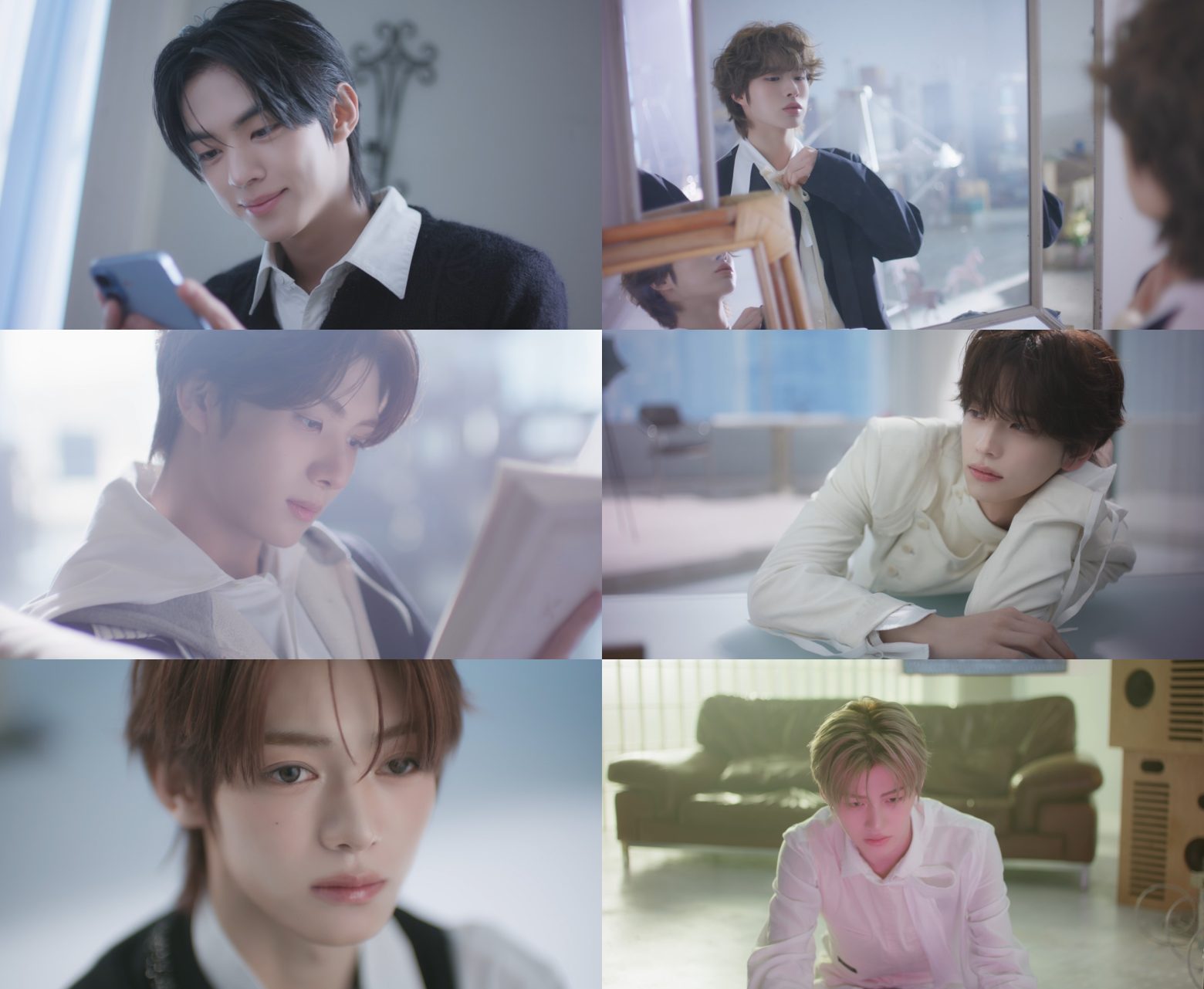 映像の前半では、恋に落ちたメンバーたちの様子が描かれる。「君が大好き」というテキストメッセージに微笑むDOHOONや、誰かのためにプレゼントを包装するKYUNGMINの姿が、初々しいときめきを表現。一方、「ロミオとジュリエット」を読みながら「star-cross’d lovers」という一節をなぞるYOUNGJAEの姿からは、静謐な美しさが漂う。