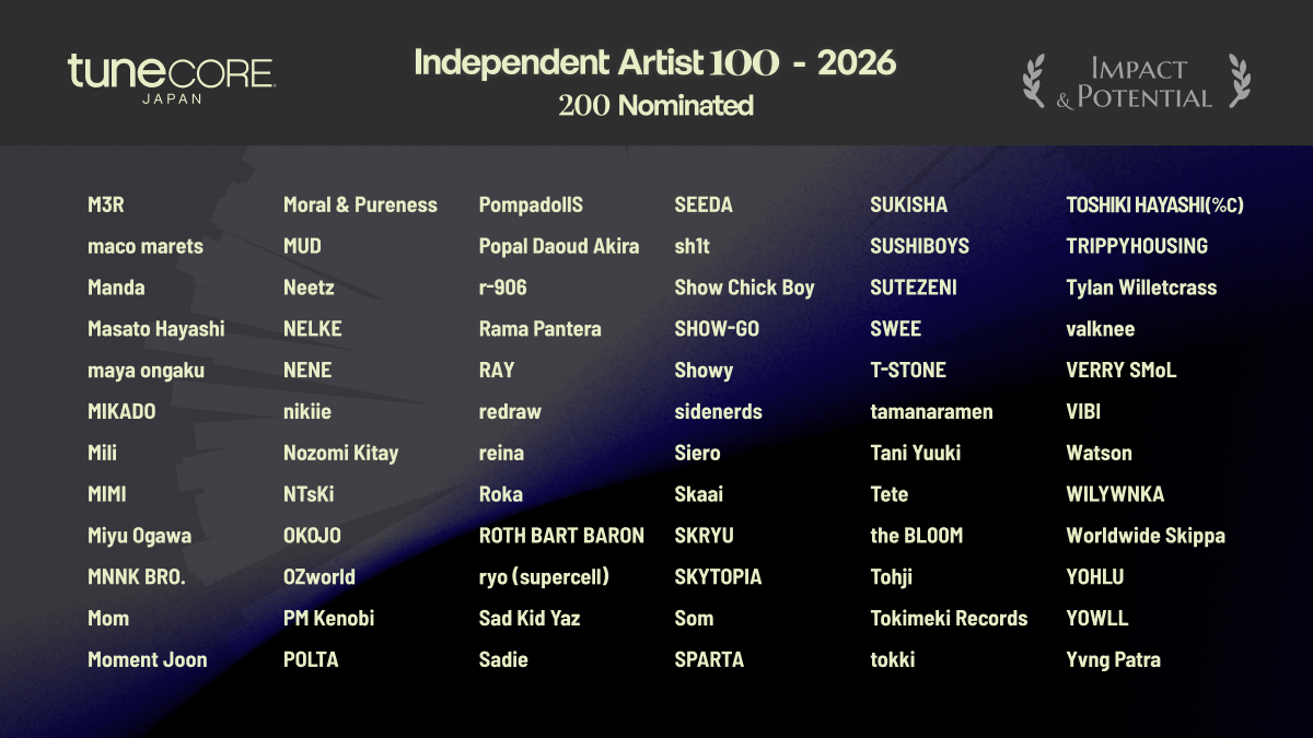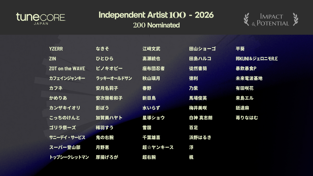 インディペンデントアーティストのための音楽デジタルディストリビューションサービス「TuneCore Japan」は、新たに未来のカルチャーへ繋ぐプロジェクト「TuneCore Japan INDEPENDENT ARTIST 100 – 2026」のノミネートアーティストを発表しました。