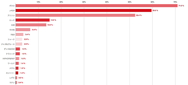 投稿する音楽ジャンルは、1位が「ボカロ」71.0%、2位が「J-POP」59.6%、3位が「アニソン」52.4%。9月にはウェブからアップロードできる機能を追加するなど、DTMユーザーがより楽曲投稿しやすくなっているため、ボーカロイド楽曲との親和性も高まっている。投稿ジャンルは年齢層とも大きく関係しており、若年層では「ボカロ」が多いのに対し、年齢層が上がると男女問わず「J-POP」が多くなってくる傾向も見られるようだ。