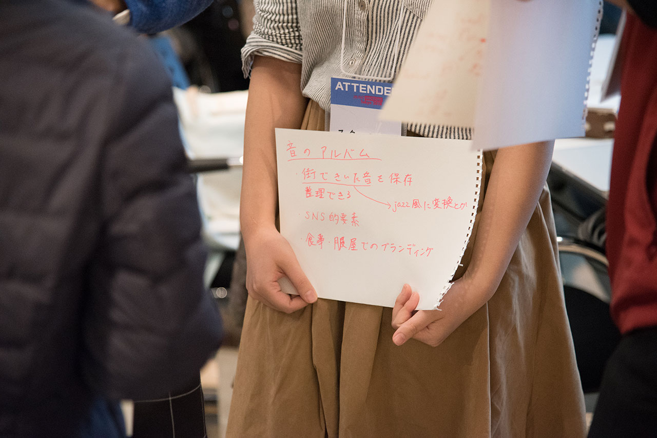 まずは、アイスブレイクとして“音楽縛り”しりとりでキーワードを画用紙に書いていく参加者達。そのキーワードを元に、今回のプロダクトを絵として描きお互いの自己紹介が行われた。
