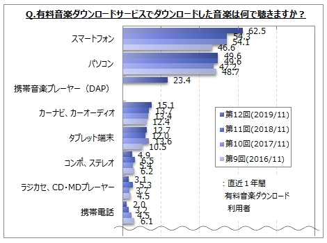 直近1年間に有料音楽ダウンロードサービスを利用した人に、音楽をダウンロードした機器を聞いたところ(複数回答)、「パソコン」が59.7%です。「スマートフォン」は50.6%で、2018年調査より増加している。