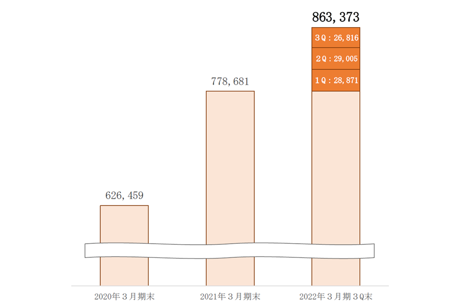 デジタルコンテンツディストリビューション業務における取扱原盤数は、2022年3月期2Q末時点の836,557原盤から26,816原盤増加し、863,373原盤となり、著作権管理楽曲数と同様に拡大している。