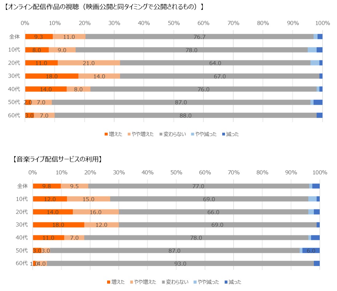 オンライン配信作品の視聴(映画公開と同タイミングで公開されるもの)については、全体の9.3%が「増えた」と回答し、「やや増えた」と合わせて20.3%となった。年代別では20代と30代が他の年代に比べて多く、20代は「増えた」「やや増えた」合わせて32.0 %、30代も32.0%という結果になった。音楽ライブ配信サービスの利用も全体の約2割が「増えた」「やや増えた」と回答した。年代別では10代の27.0%、20代の30.0%、30代の30.0 %が「増えた」「やや増えた」と回答し、若年層にサービス利用が広がり始めていることが分かった。