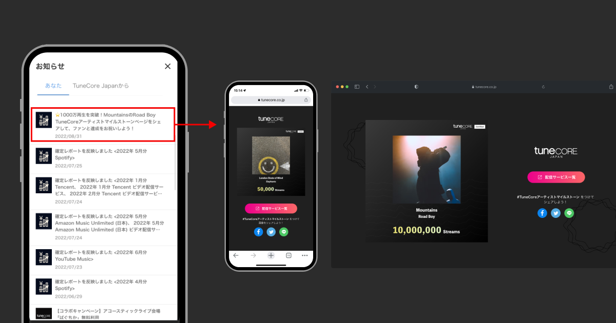 TuneCore Japan を利用しているアーティストは、配信されている楽曲またはアーティストの累計ストリーミング再生数が「10,000再生を突破」「5,000,000再生を突破」といった節目を達成するごとに、お祝いのマイルストーンイメージとマイルストーンページが自動で生成され、記念すべき瞬間を見逃すことなく、ファンと共有することができるようになる。